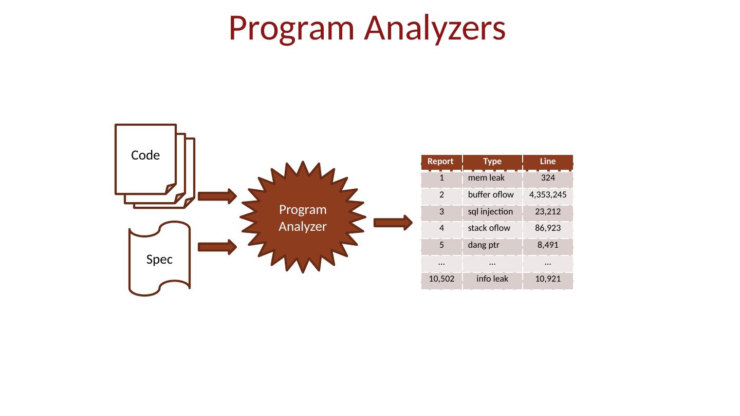 10 .Program Analyzers Code Report Type Line 1 mem leak 324 2 buffer oflow 4,353,245 3 sql injection 23,212 4 stack oflow 86,923 5 dang ptr 8,491 … … … 10,502 info leak 10,921 Program Analyzer Spec