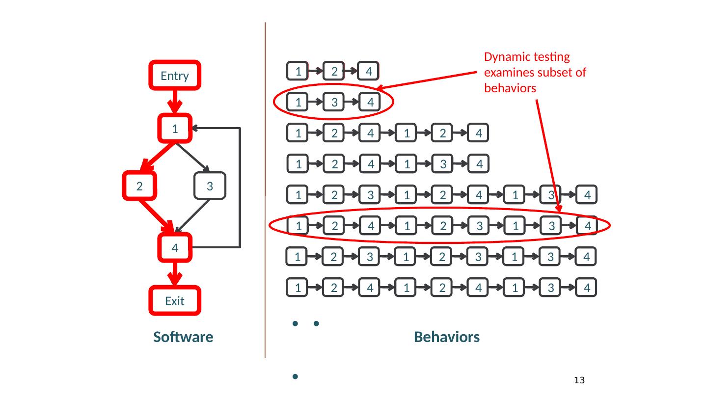 13 .Entry 1 2 3 4 Software Exit Behaviors Entry 1 2 4 Exit 1 2 4 1 2 4 1 3 4 1 2 4 1 2 4 1 2 3 1 2 4 1 3 4 1 2 4 1 2 3 1 3 4 1 2 3 1 2 3 1 3 4 1 2 4 1 2 4 1 3 4 . . . 1 2 4 1 3 4 13 Dynamic testing examines subset of behaviors