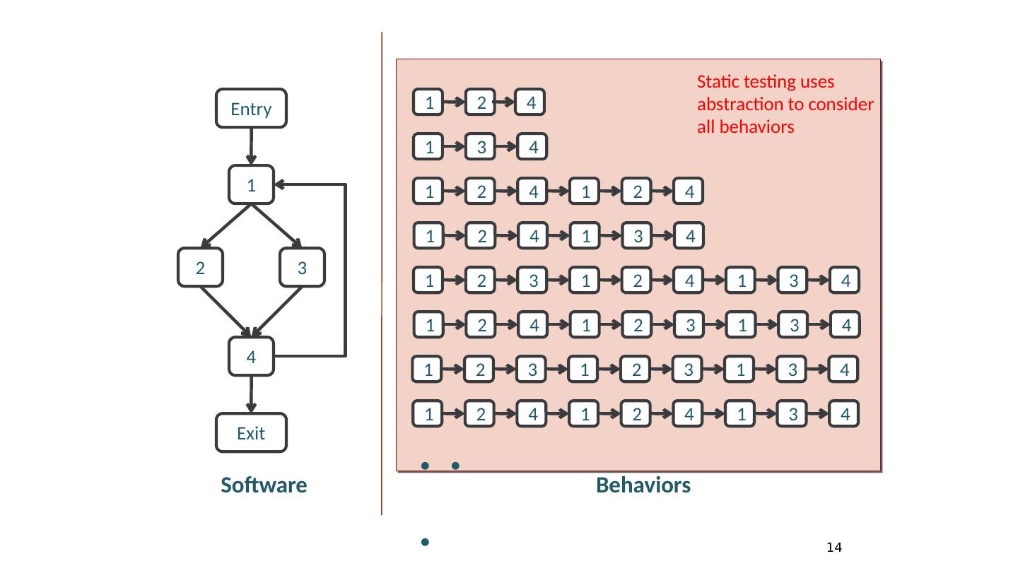 14 .Entry 1 2 3 4 Software Exit Behaviors 1 2 4 1 3 4 1 2 4 1 2 4 1 2 3 1 2 4 1 3 4 1 2 4 1 2 3 1 3 4 1 2 3 1 2 3 1 3 4 1 2 4 1 2 4 1 3 4 . . . 1 2 4 1 3 4 14 Static testing uses abstraction to consider all behaviors