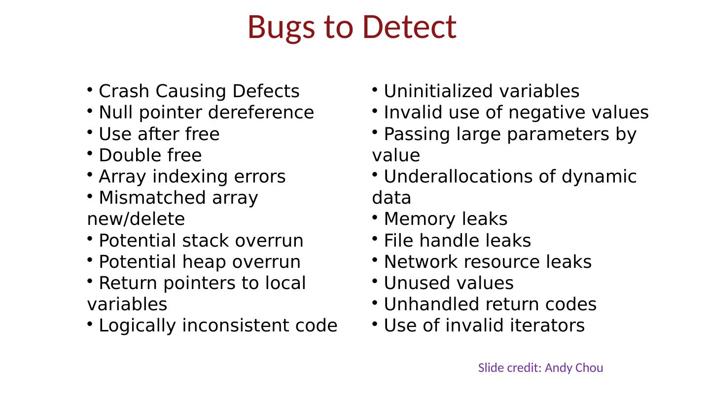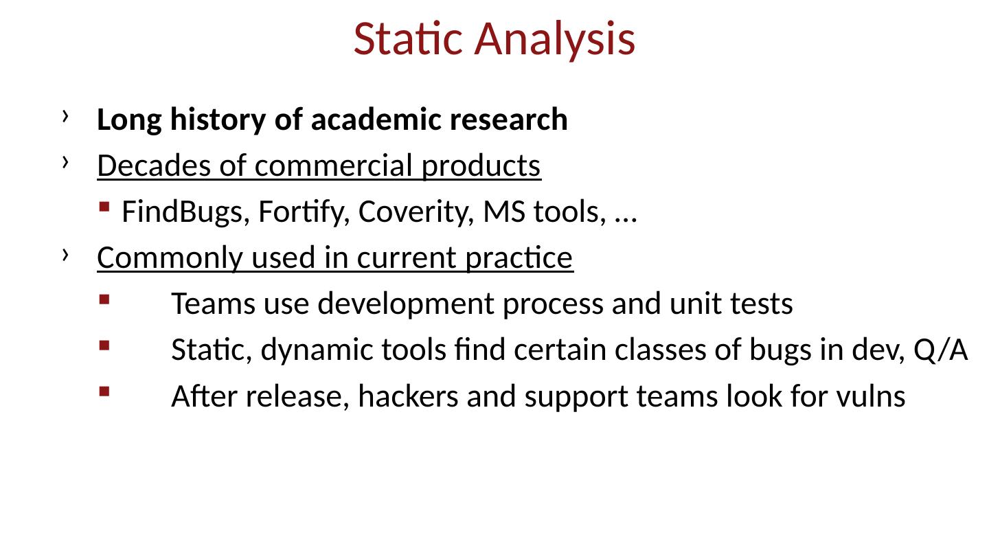 15 .Static Analysis Long history of academic research Decades of commercial products FindBugs , Fortify, Coverity, MS tools, … Commonly used in current practice Teams use development process and unit tests Static, dynamic tools find certain classes of bugs in dev, Q/A After release, hackers and support teams look for vulns