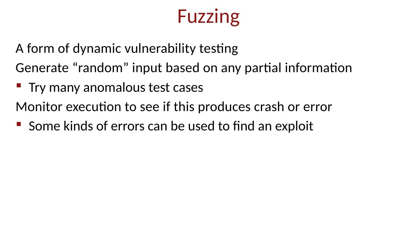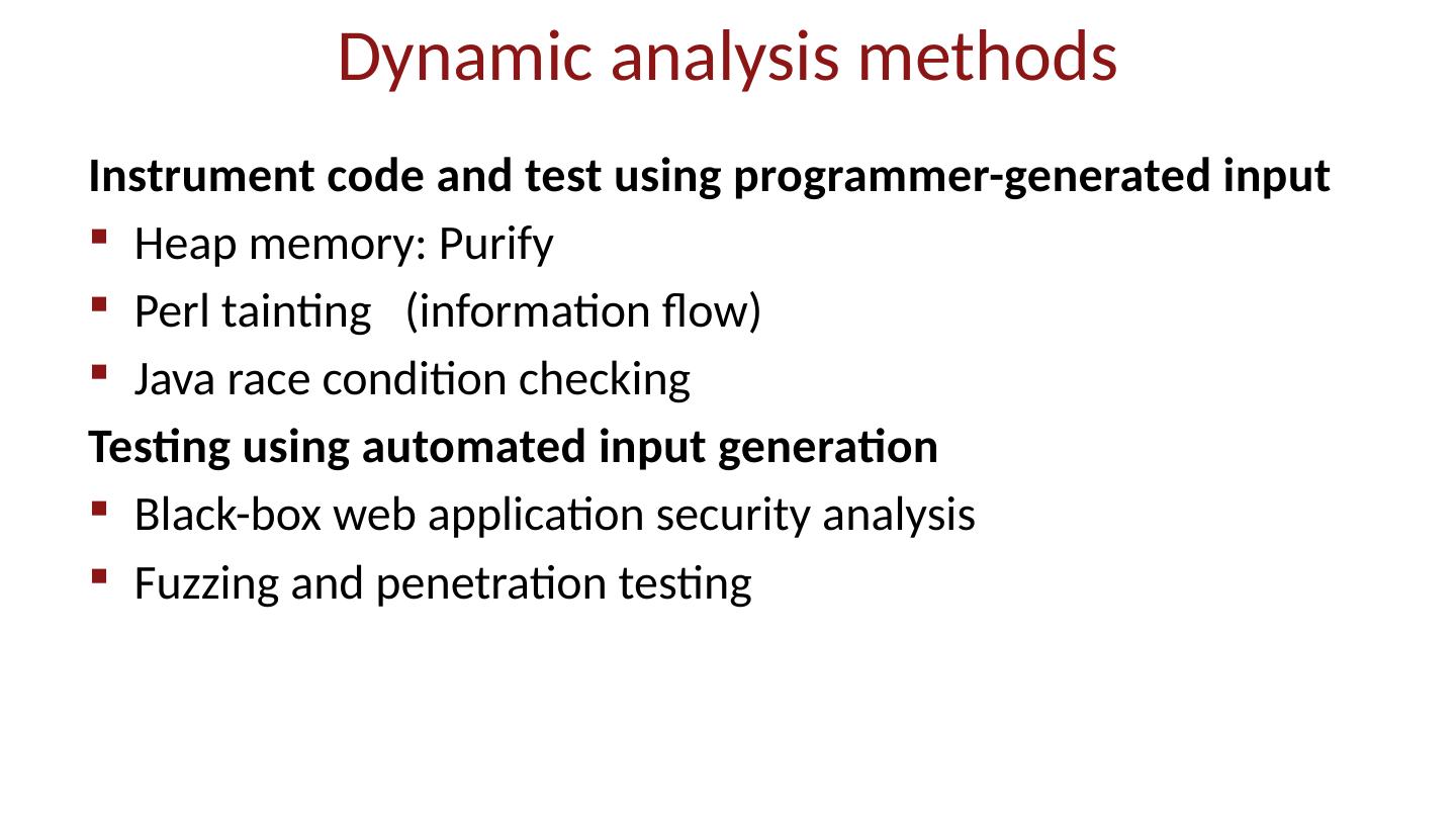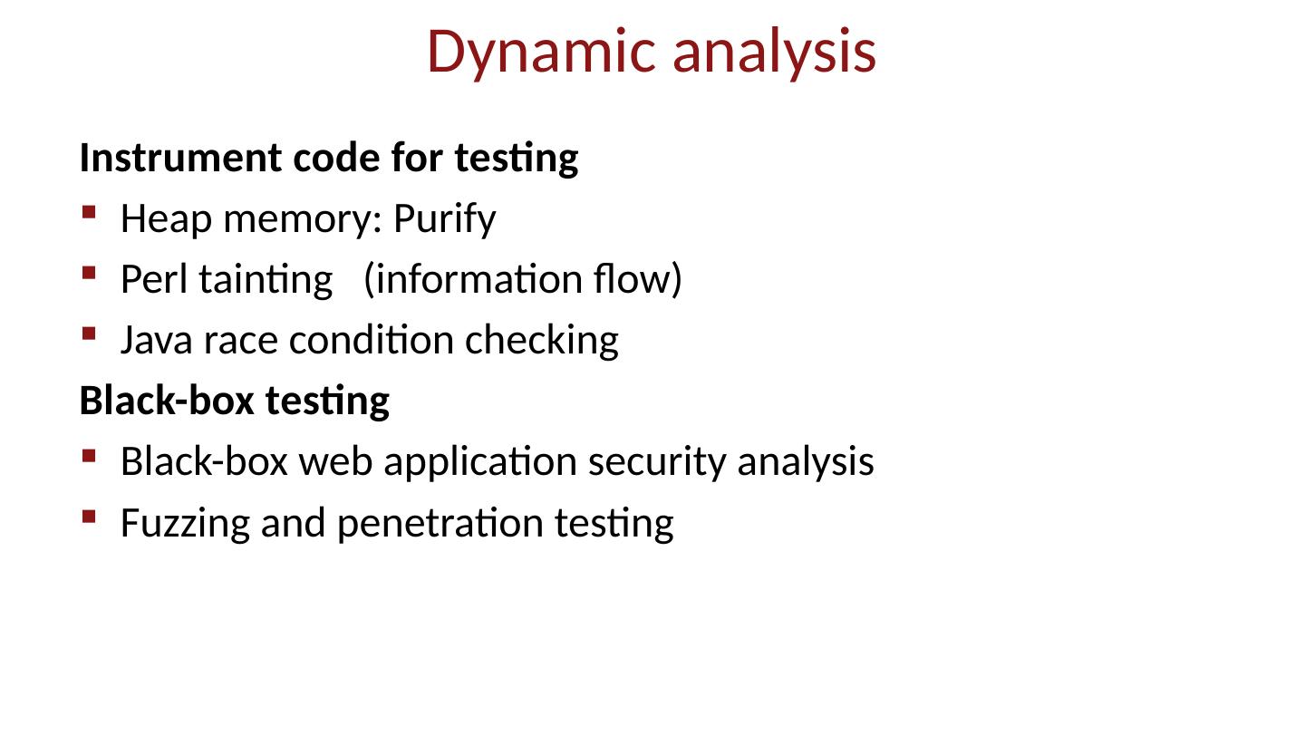 16 .Dynamic analysis Instrument code for testing Heap memory: Purify Perl tainting (information flow) Java race condition checking Black-box testing Black-box web application security analysis Fuzzing and penetration testing