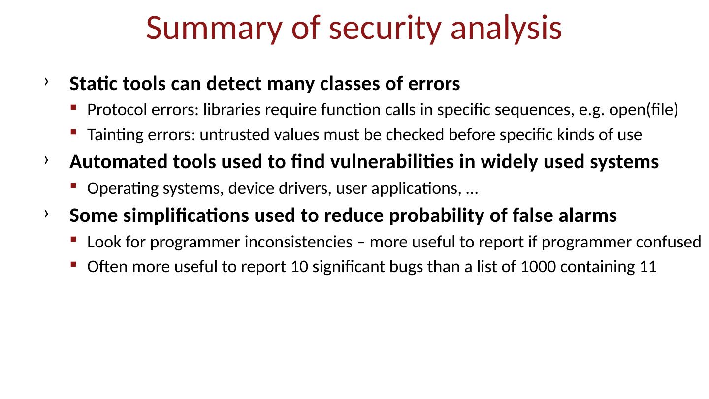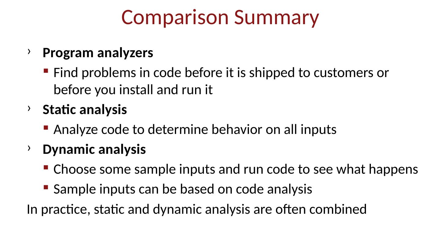 17 .Comparison Summary Program analyzers Find problems in code before it is shipped to customers or before you install and run it Static analysis Analyze code to determine behavior on all inputs Dynamic analysis Choose some sample inputs and run code to see what happens Sample inputs can be based on code analysis In practice, static and dynamic analysis are often combined