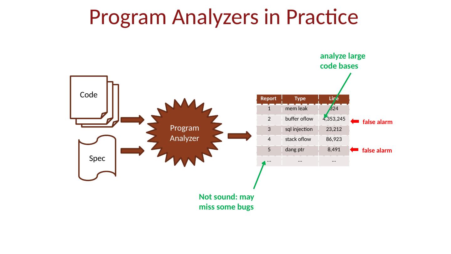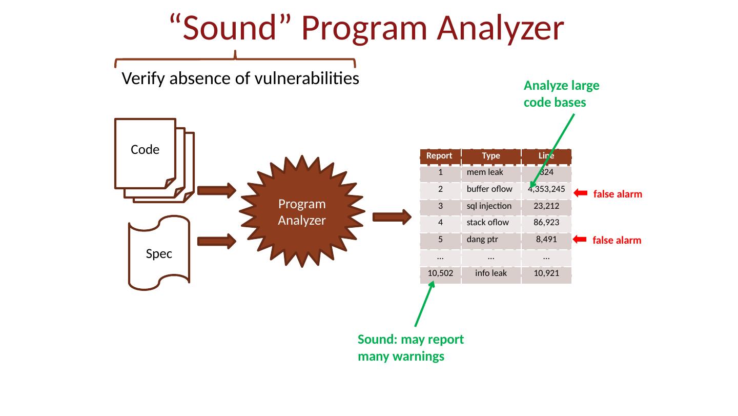 19 .“Sound” Program Analyzer Code Report Type Line 1 mem leak 324 2 buffer oflow 4,353,245 3 sql injection 23,212 4 stack oflow 86,923 5 dang ptr 8,491 … … … 10,502 info leak 10,921 Program Analyzer Spec Sound: ma y report many warnings Analyze large code bases false alarm false alarm Verify absence of vulnerabilities