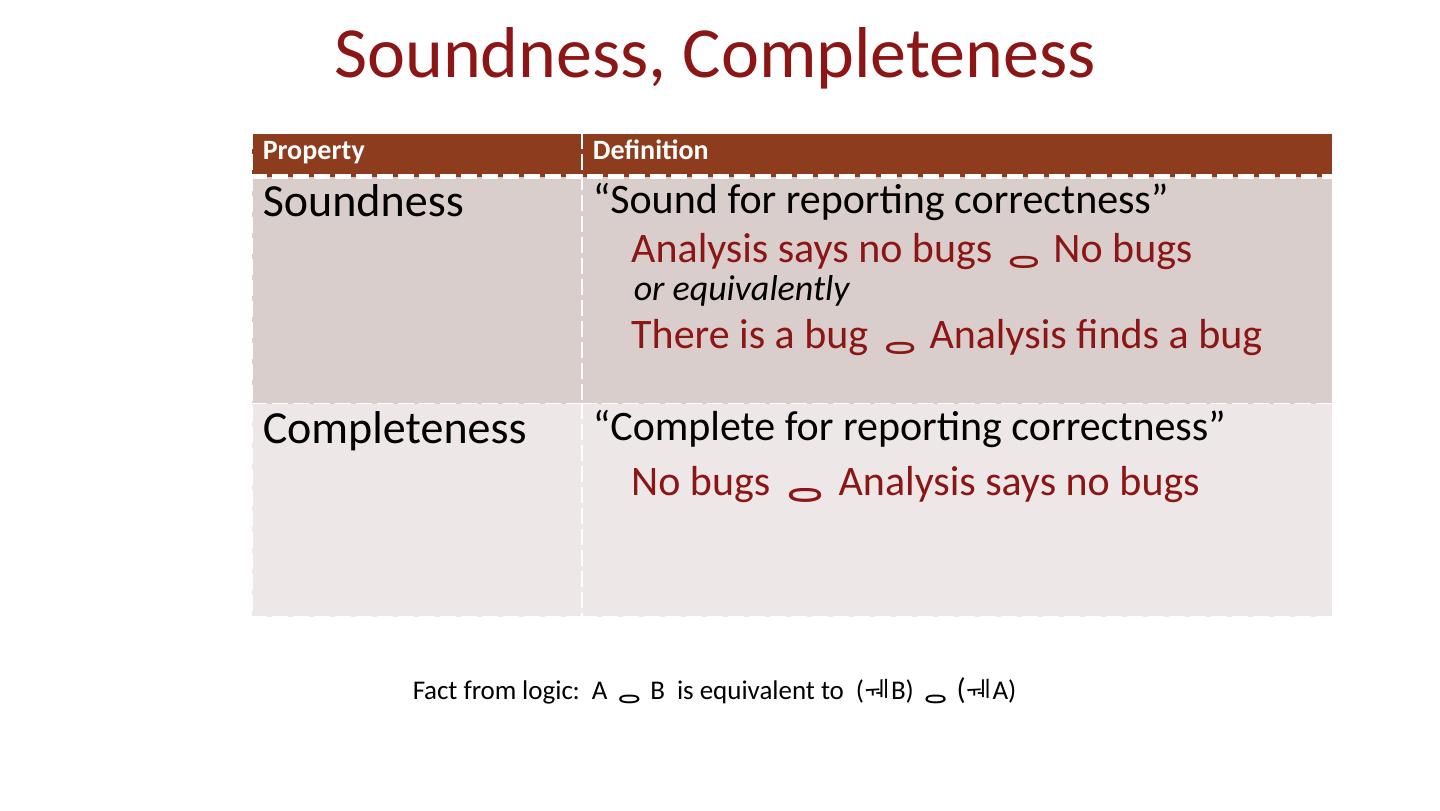 20 .Soundness, Completeness Property Definition Soundness “Sound for reporting correctness” Analysis says no bugs N o bugs or equivalently There is a bug Analysis finds a bug Completeness “Complete for reporting correctness” No bugs Analysis says no bugs Fact from logic: A B is equivalent to (B) ( A)