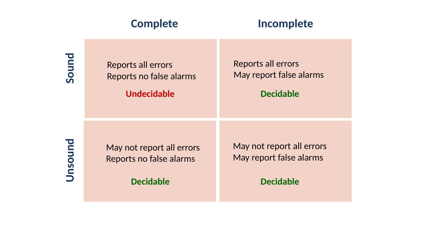 21 .Complete Incomplete Sound Unsound Reports all errors Reports no false alarms Reports all errors May report false alarms Undecidable Decidable Decidable May not report all errors May report false alarms Decidable May not report all errors Reports no false alarms