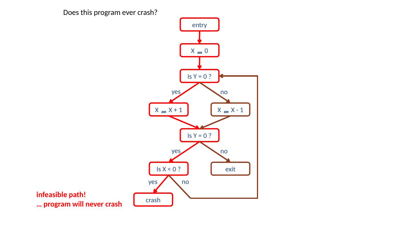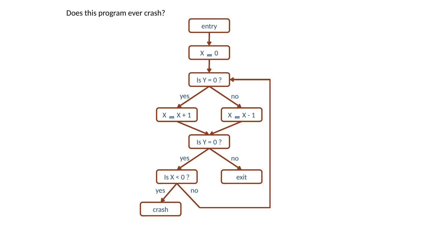 24 .entry X 0 Is Y = 0 ? X X + 1 X X - 1 Is Y = 0 ? Is X < 0 ? exit crash yes no yes no yes no Does this program ever crash?