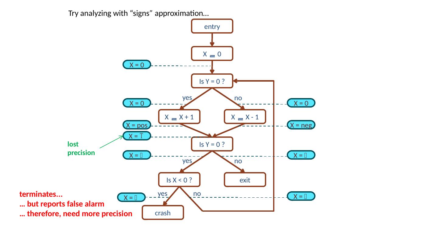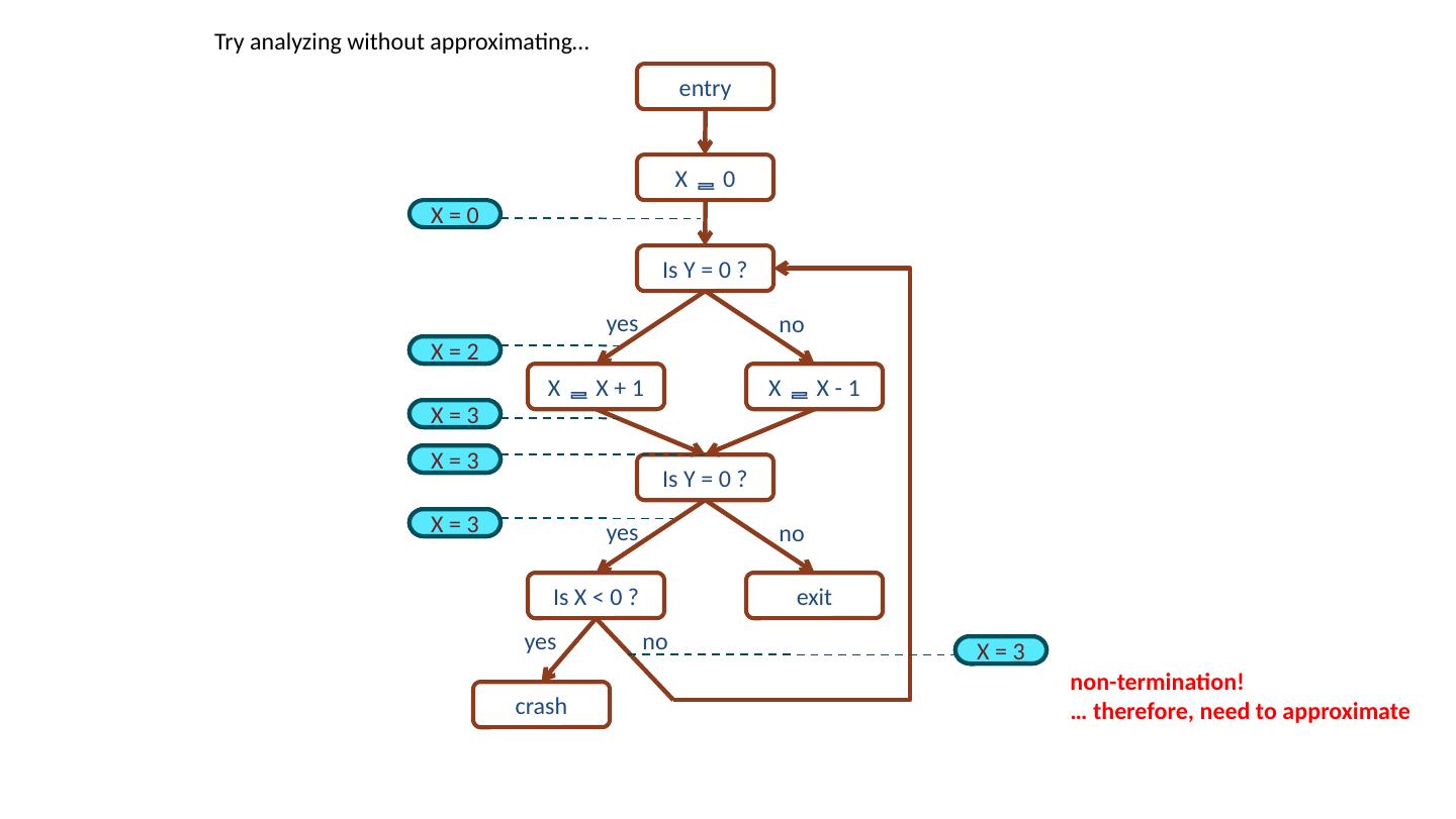 26 .entry X 0 Is Y = 0 ? X X + 1 X X - 1 Is Y = 0 ? Is X < 0 ? exit crash yes no yes no yes no X = 0 X = 0 X = 1 X = 1 X = 1 X = 1 X = 1 X = 2 X = 2 X = 2 X = 2 X = 2 X = 3 X = 3 X = 3 X = 3 non-termination! … therefore, need to approximate Try analyzing without approximating…