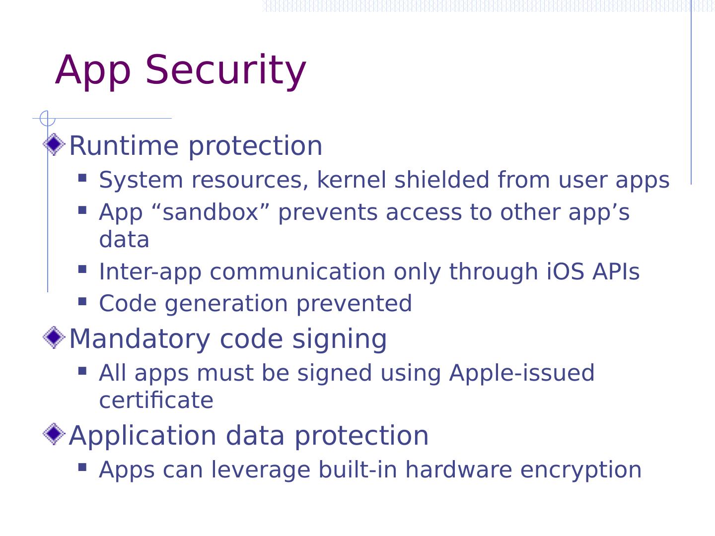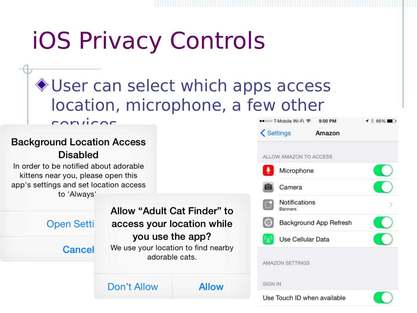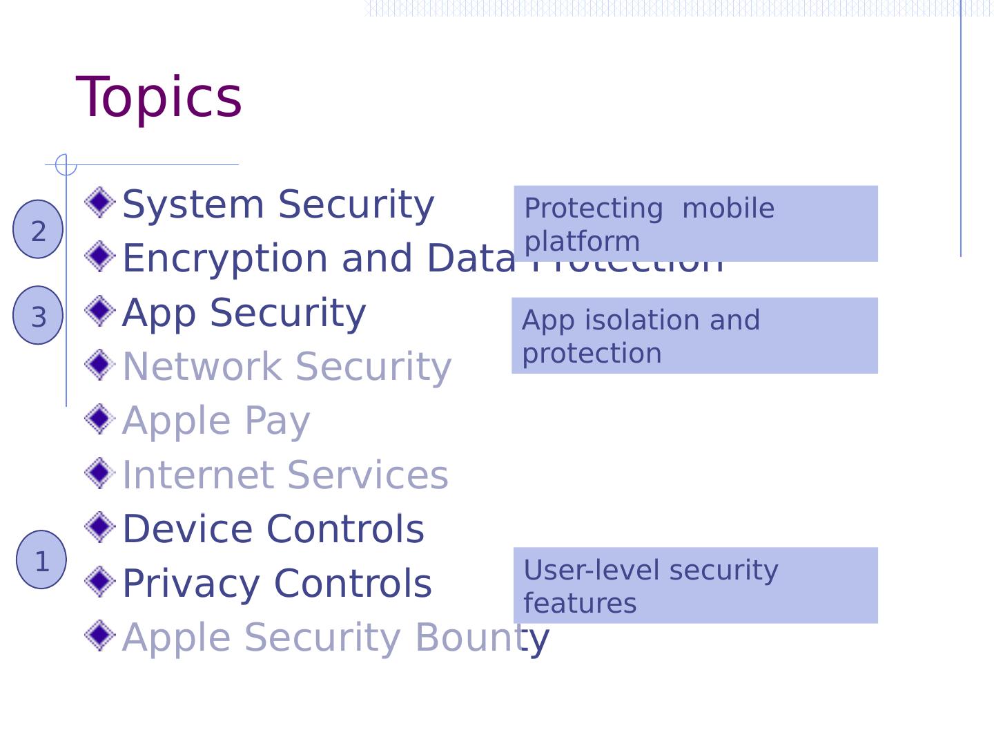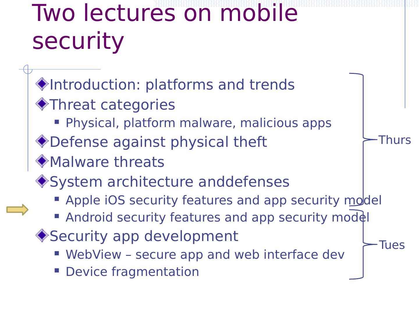 2 .Two lectures on mobile security Introduction: platforms and trends Threat categories Physical, platform malware, malicious apps Defense against physical theft Malware threats System architecture and defenses Apple iOS security features and app security model Android security features and app security model Security app development WebView – secure app and web interface dev Device fragmentation Thurs Tues
