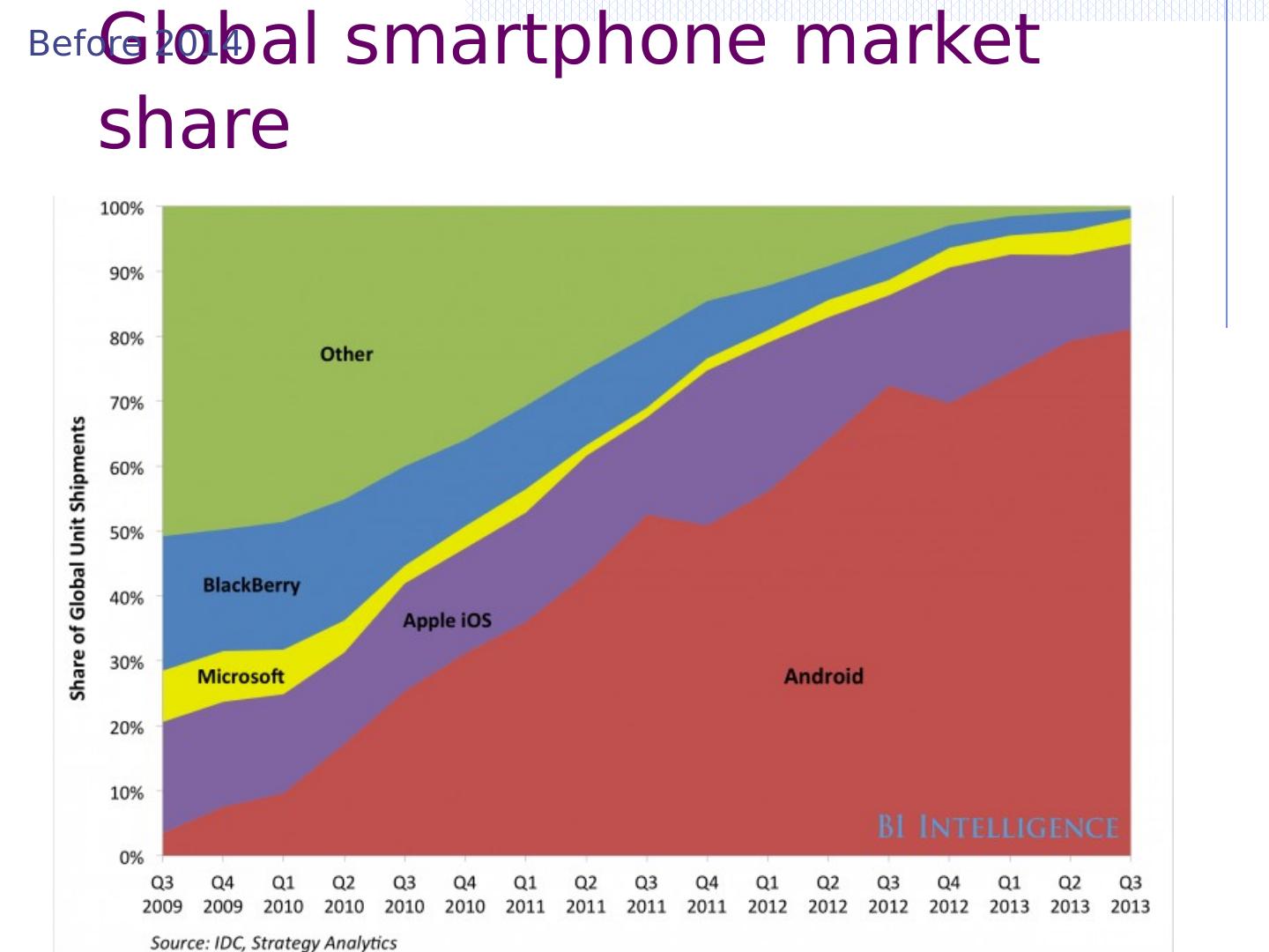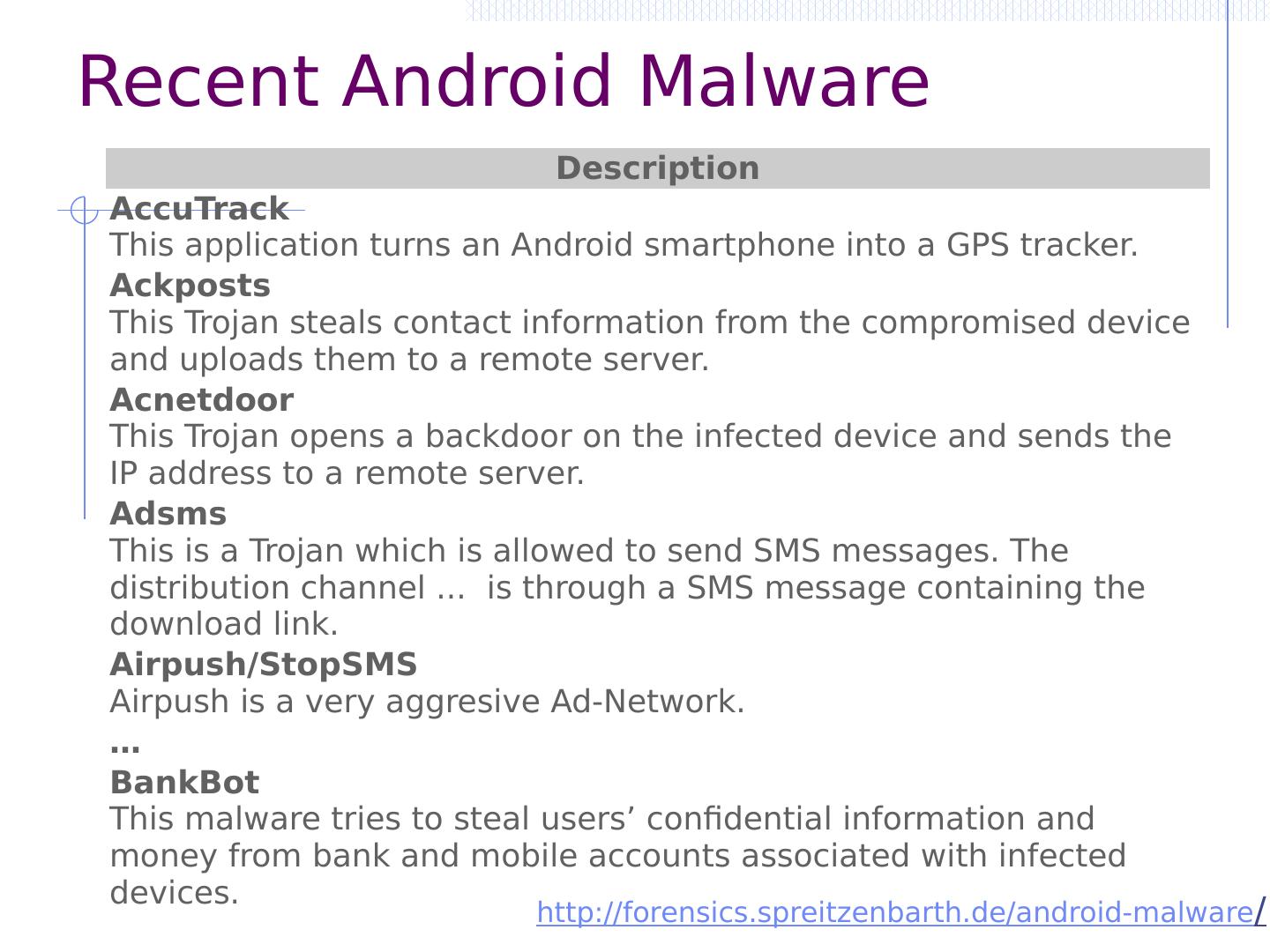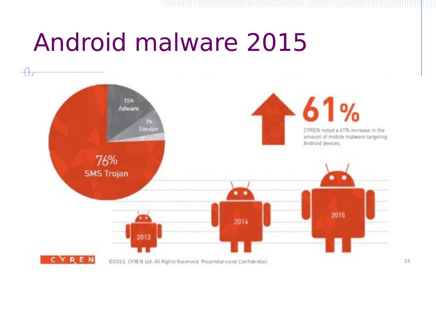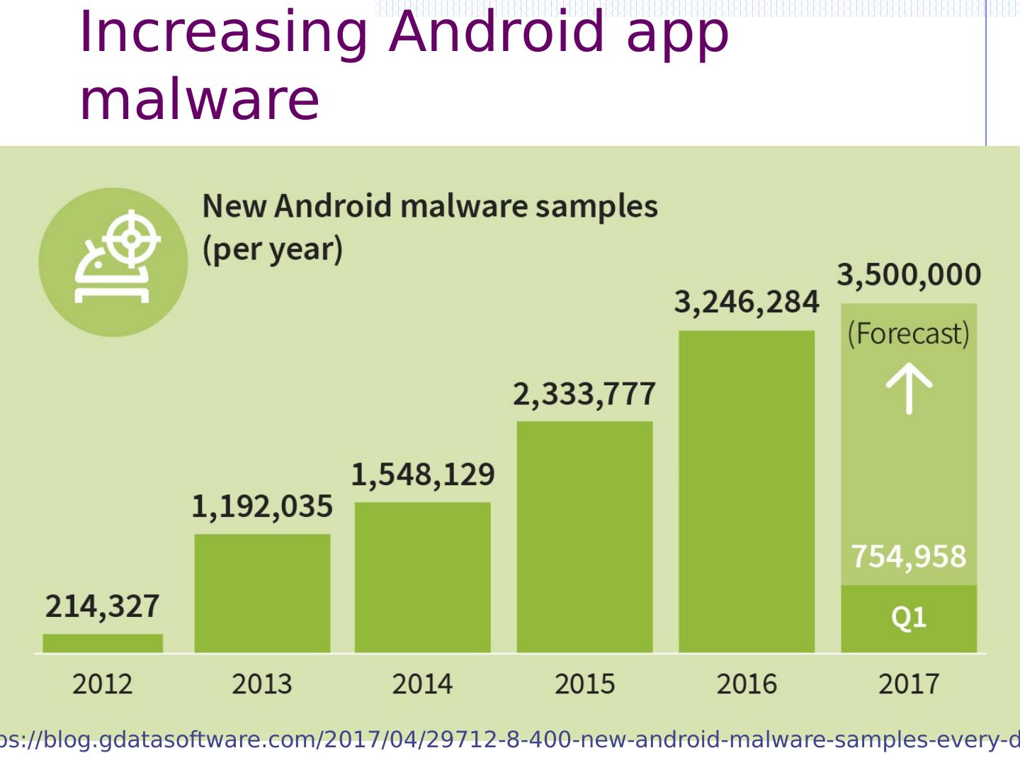 2 .Two lectures on mobile security Introduction: platforms and trends Threat categories Physical, platform malware, malicious apps Defense against physical theft Malware threats System architecture and defenses Apple iOS security features and app security model Android security features and app security model Security app development WebView – secure app and web interface dev Device fragmentation Thurs Tues