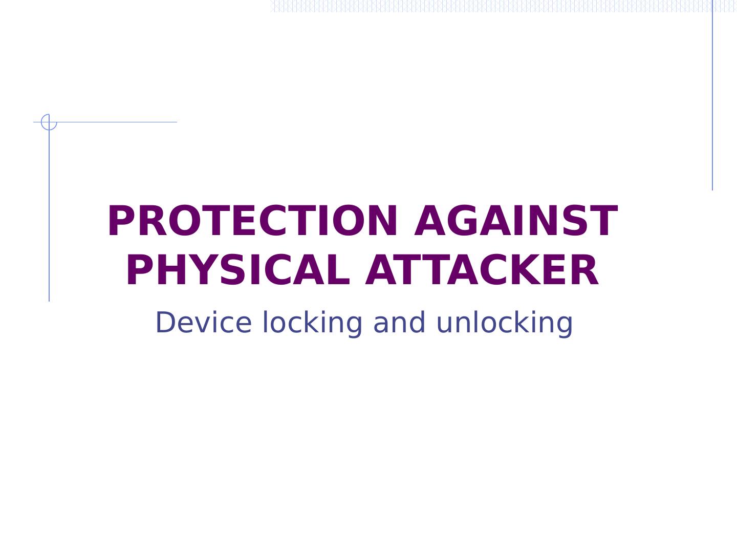 24 .Summary: locking and unlocking Protect from thief via user authentication Commonly: pin, swipe, etc. Future: Biometric? Token on body? Can phone destroy itself if too many tries? Physical access can allow Thief to jailbreak and crack password/pin Subject phone to other attacks Next defense: erase phone when stolen