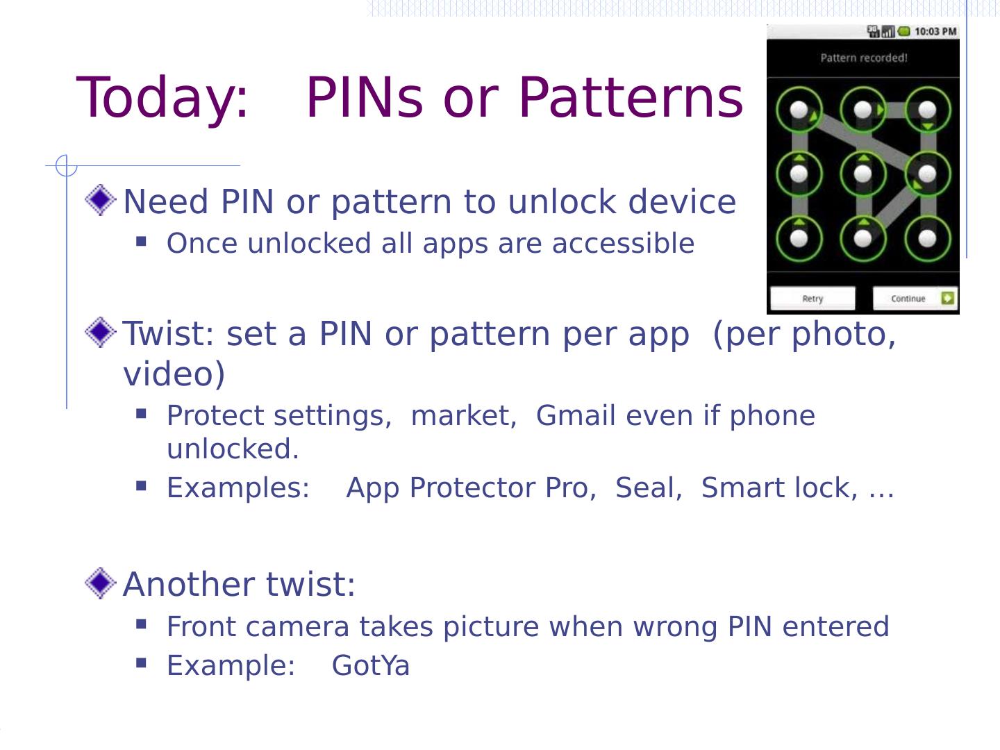 18 .Today: PINs or Patterns Need PIN or pattern to unlock device Once unlocked all apps are accessible Twist: set a PIN or pattern per app (per photo, video) Protect settings, market, Gmail even if phone unlocked. Examples: App Protector Pro, Seal, Smart lock, … Another twist: Front camera takes picture when wrong PIN entered Example: GotYa