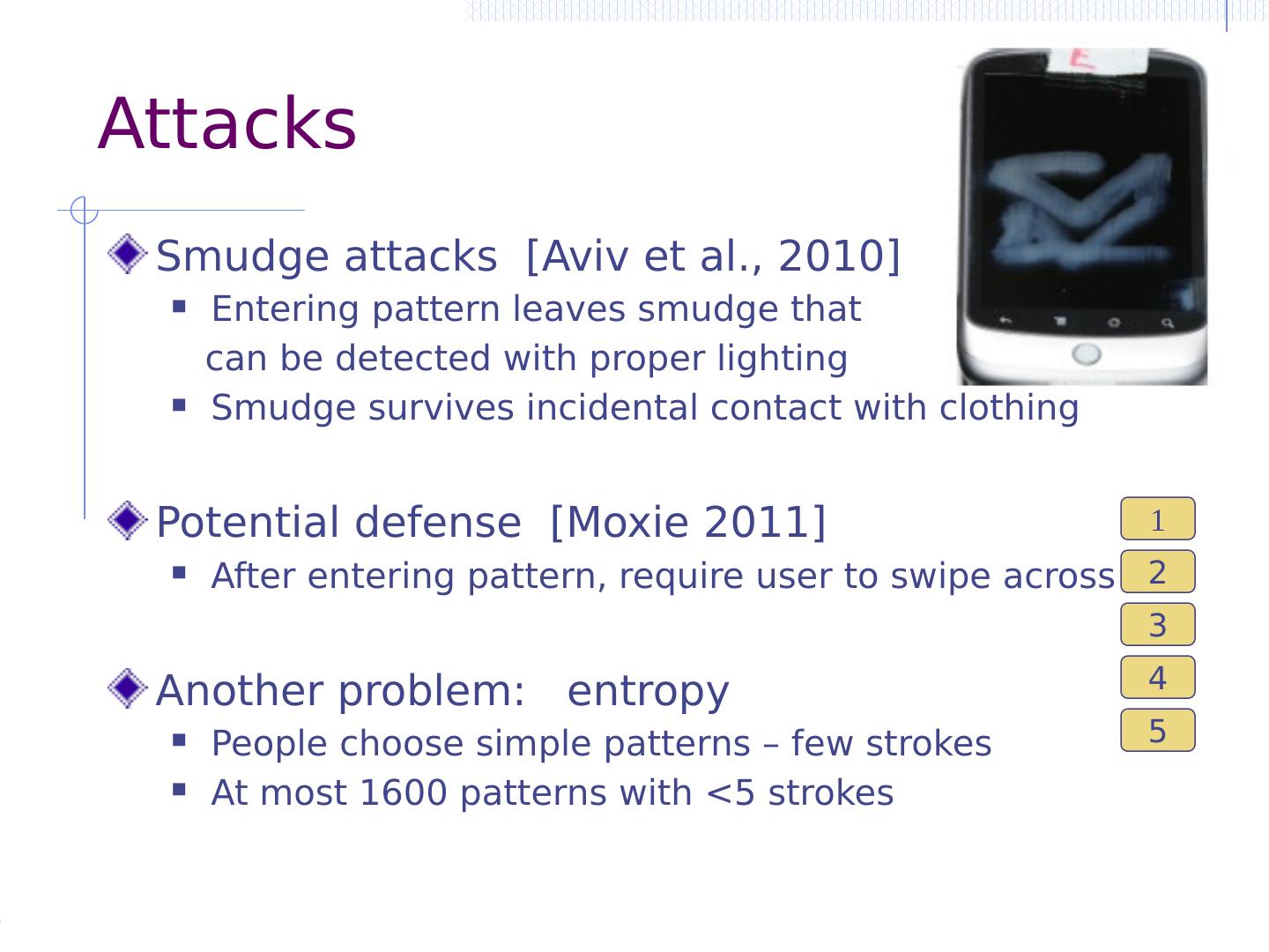 20 .Attacks Smudge attacks [Aviv et al., 2010] Entering pattern leaves smudge that can be detected with proper lighting Smudge survives incidental contact with clothing Potential defense [Moxie 2011] After entering pattern, require user to swipe across Another problem: entropy People choose simple patterns – few strokes At most 1600 patterns with <5 strokes 1 2 3 4 5