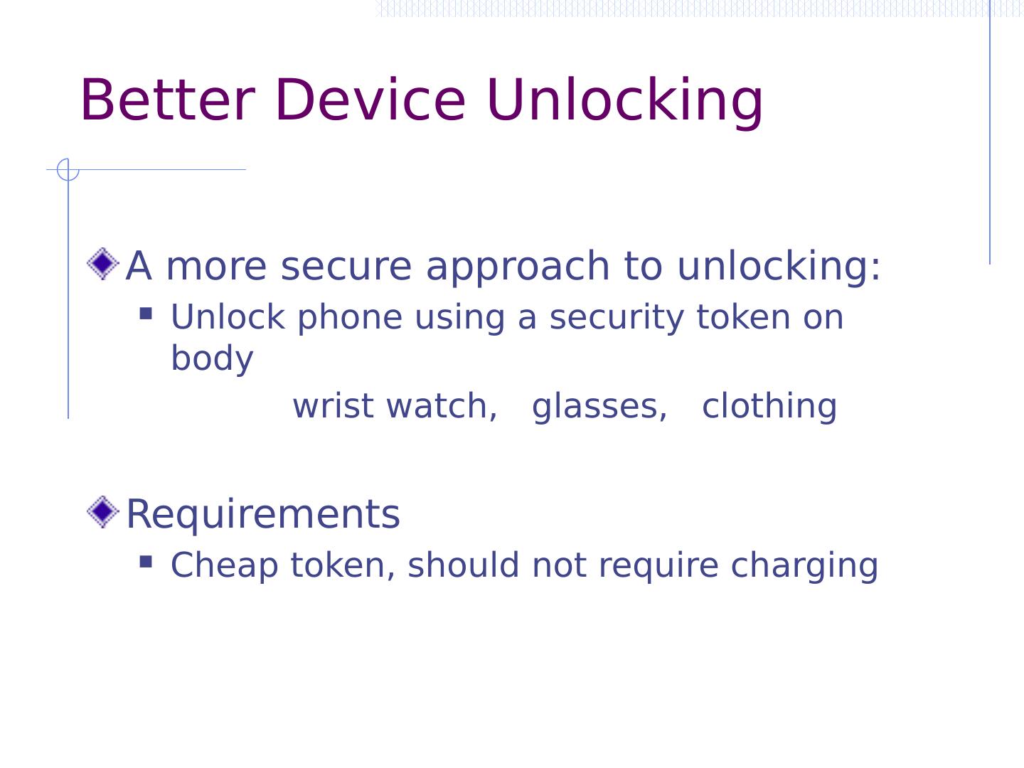 23 .Better Device Unlocking A more secure approach to unlocking: Unlock phone using a security token on body wrist watch, glasses, clothing Requirements Cheap token, should not require charging
