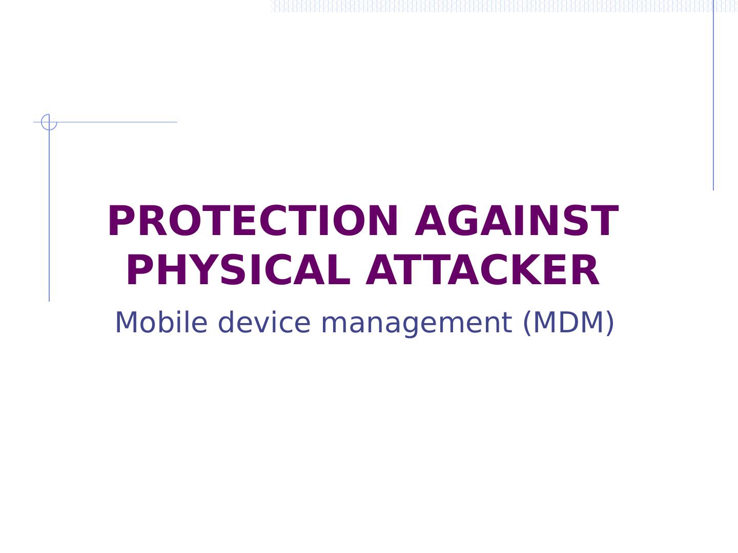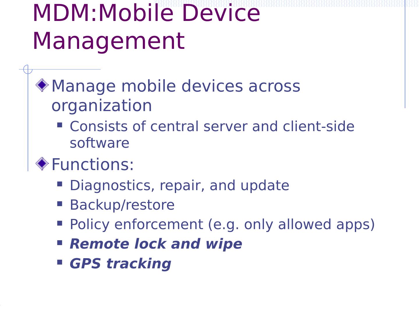 26 .MDM:Mobile Device Management Manage mobile devices across organization Consists of central server and client-side software Functions: Diagnostics, repair, and update Backup/restore Policy enforcement (e.g. only allowed apps) Remote lock and wipe GPS tracking