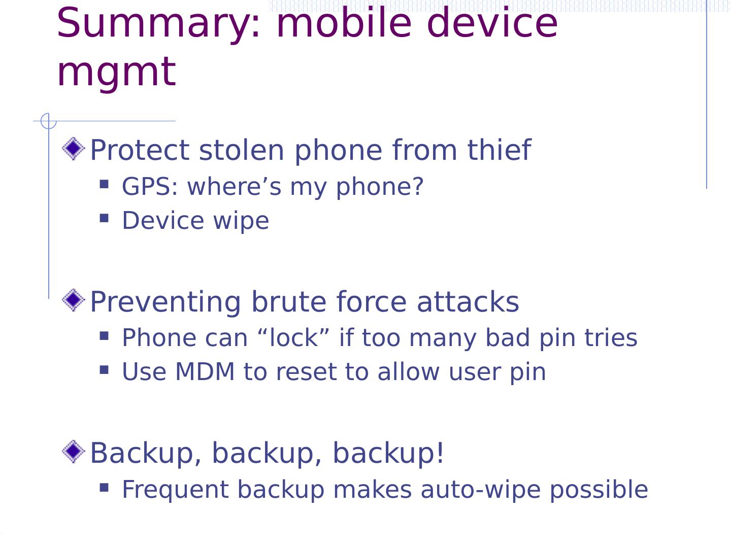 28 .Summary: mobile device mgmt Protect stolen phone from thief GPS: where’s my phone? Device wipe Preventing brute force attacks Phone can “lock” if too many bad pin tries Use MDM to reset to allow user pin Backup, backup, backup! Frequent backup makes auto-wipe possible