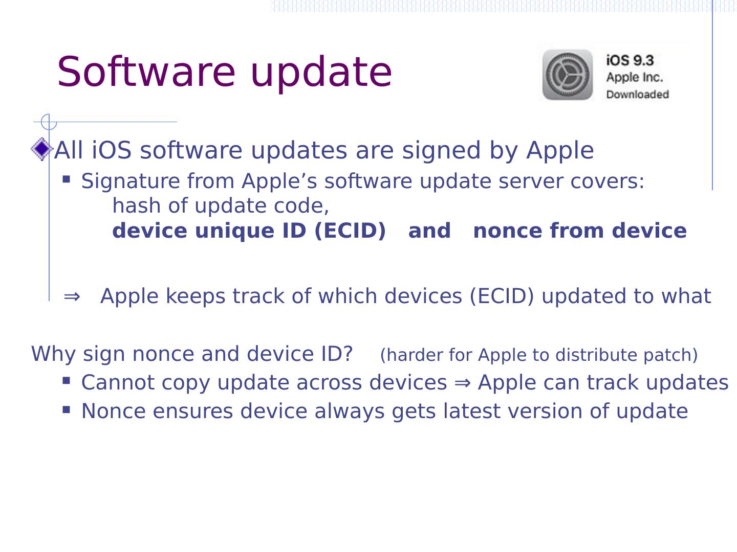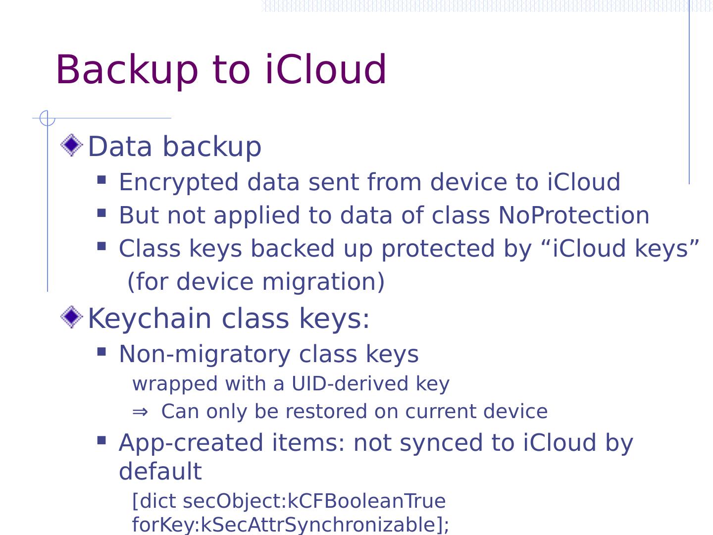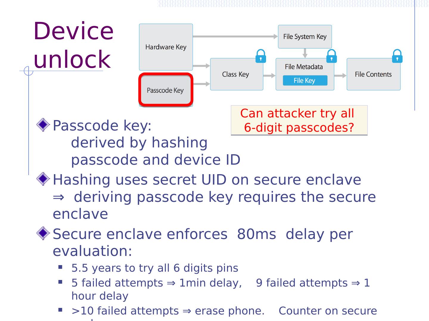 22 .iOS 4.0: PIN brute force attack After device is jail broken, can PIN be extracted? [Needed to read encrypted data partition (later topic)] iOS key management (abstract): Testing 10,000 PINs for each, derive and test class key ≈ 20 mins on iPhone 4 [ Bedrune , Sigwald , 2011] HW UID key (AES key unique to device, cannot extract) | 4 digit PIN | decrypt stored key class key (decrypts keychain) ( code.google.com /p/ iphone-dataprotection )