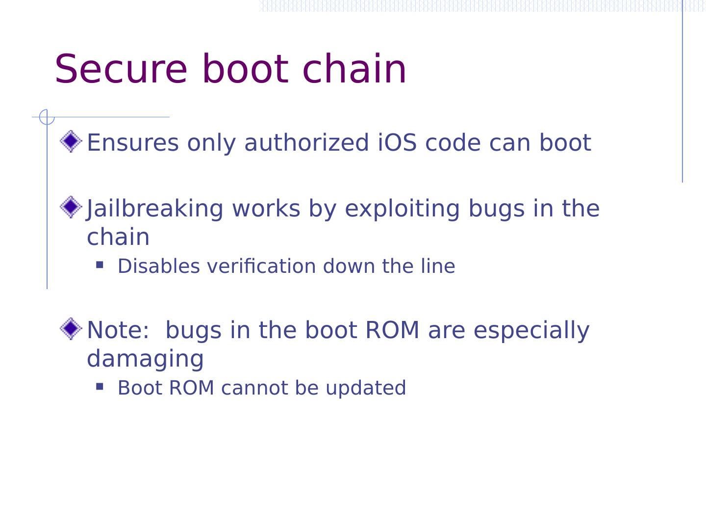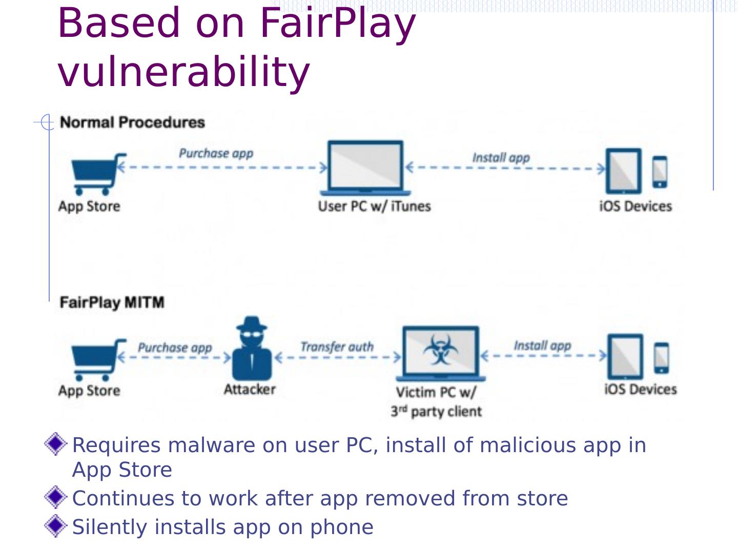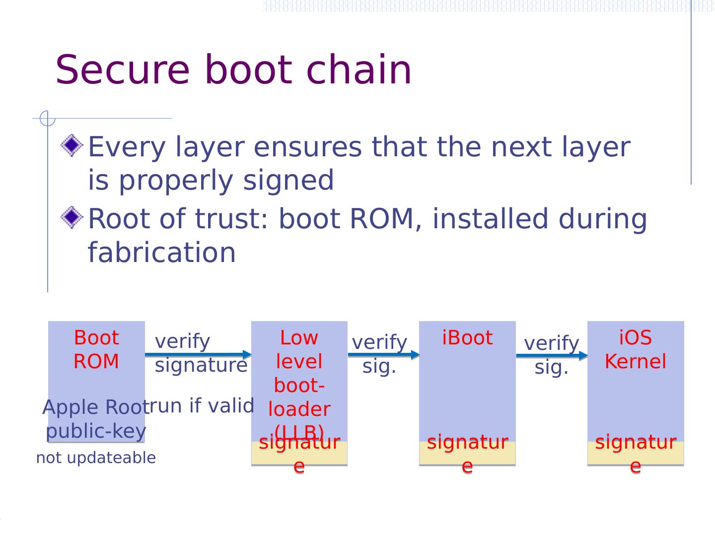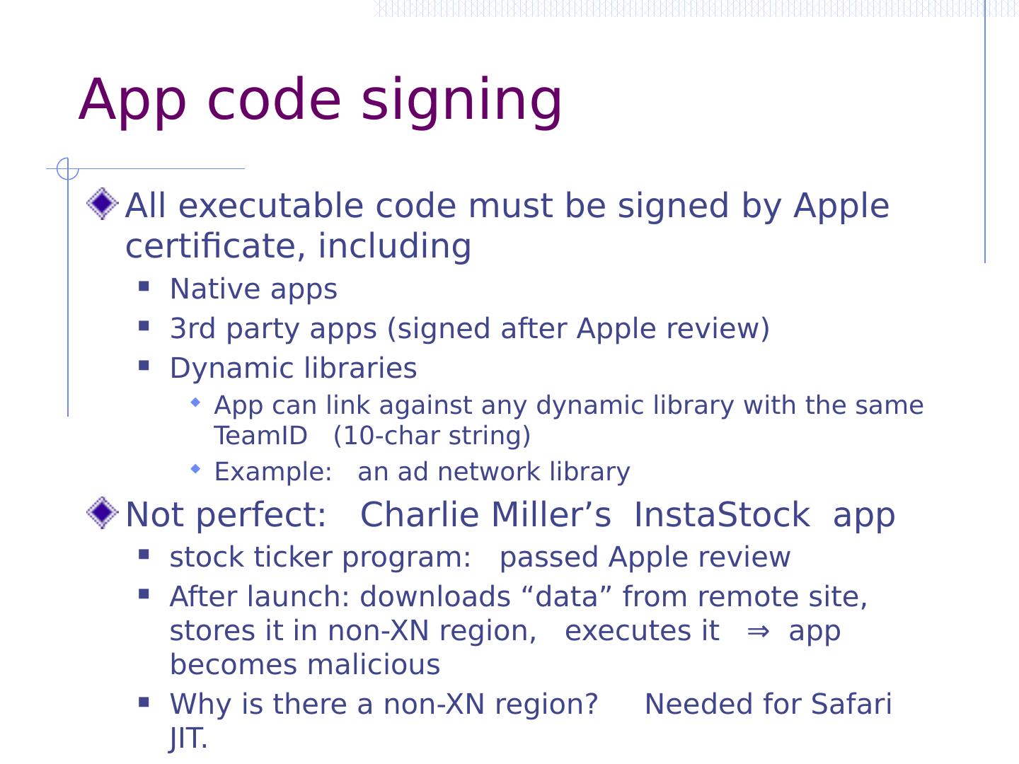 22 .iOS 4.0: PIN brute force attack After device is jail broken, can PIN be extracted? [Needed to read encrypted data partition (later topic)] iOS key management (abstract): Testing 10,000 PINs for each, derive and test class key ≈ 20 mins on iPhone 4 [ Bedrune , Sigwald , 2011] HW UID key (AES key unique to device, cannot extract) | 4 digit PIN | decrypt stored key class key (decrypts keychain) ( code.google.com /p/ iphone-dataprotection )