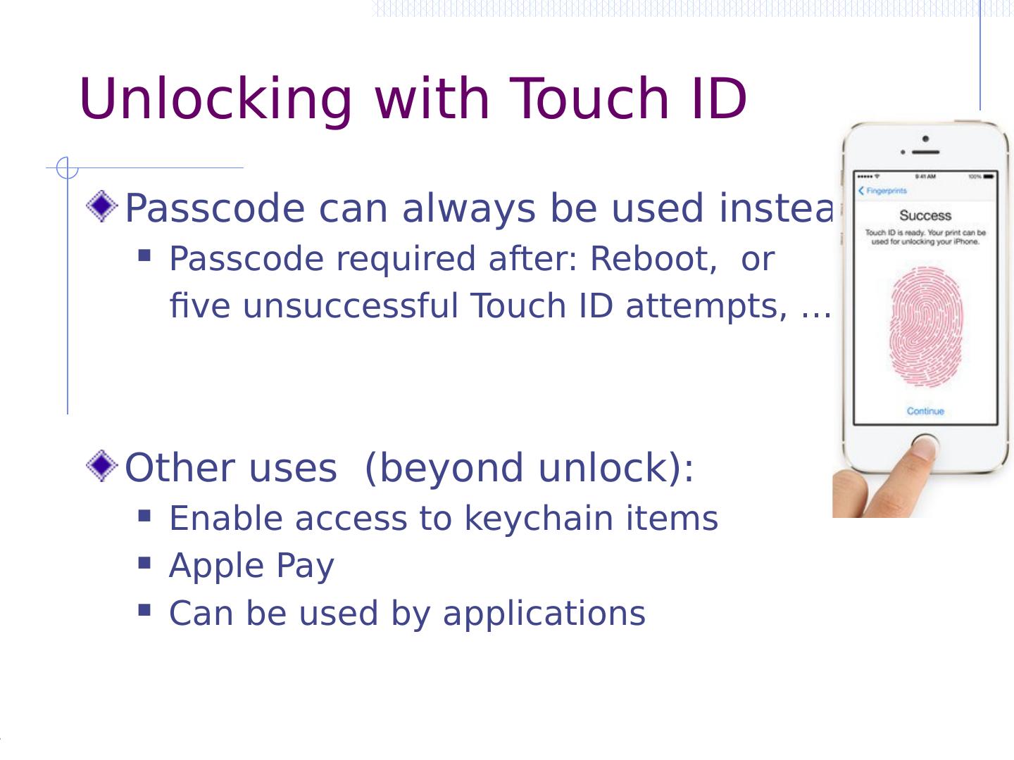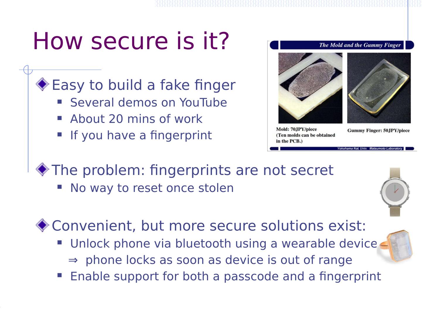 21 .Biometric unlocking Biometric unlock: Fingerprint ( Morotola Atrix 4G) Requires backup PIN ⇒ no more secure than PIN Android ICS: Face Unlock Concerns about security Standard biometric security concerns: Not secret and cannot be changed. fingerprint scanner
