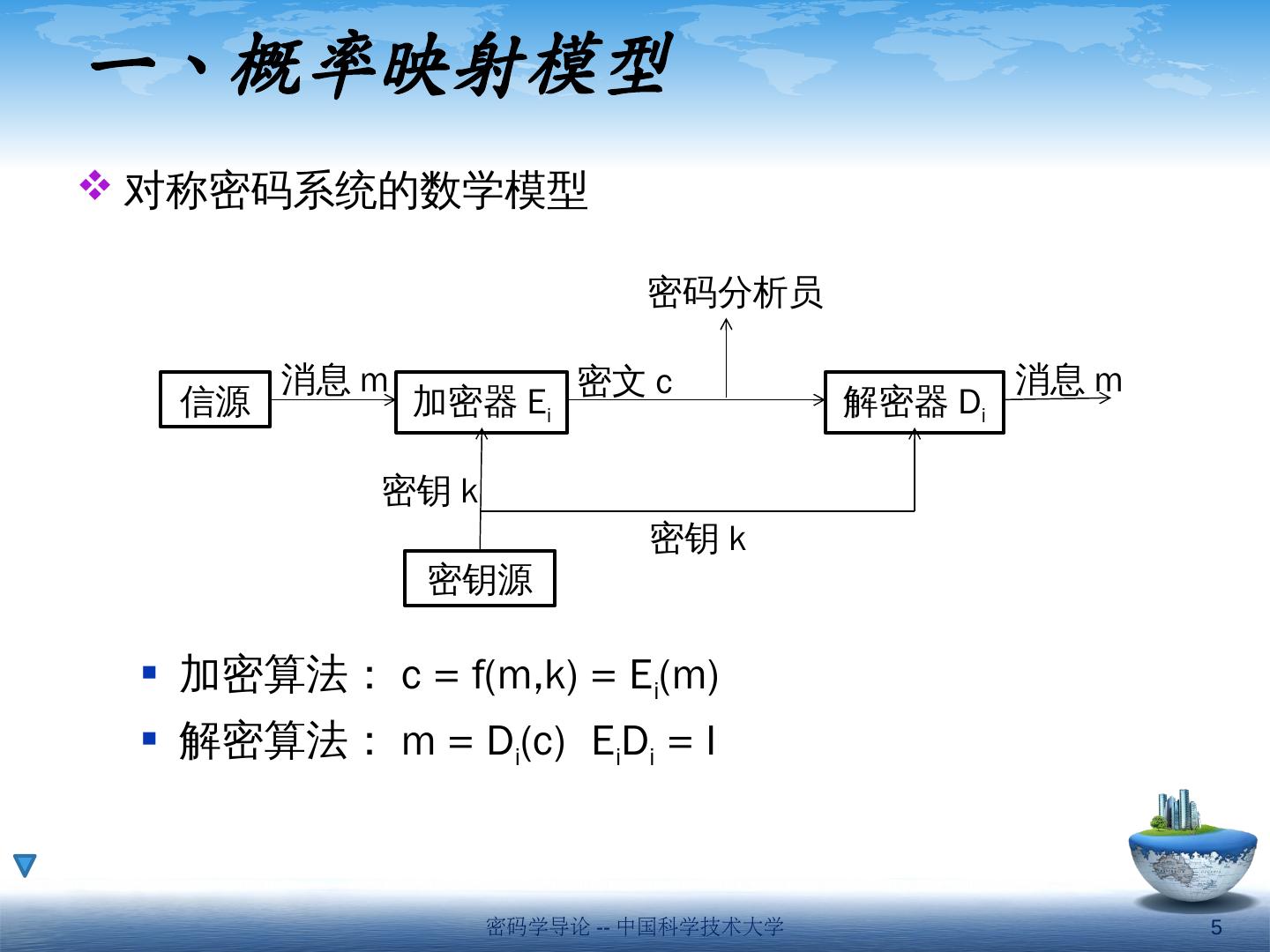 5 .一、概率映射模型 对称密码系统的数学模型 加密算法: c = f( m,k ) = E i (m) 解密算法: m = D i (c) E i D i = I 信源 密钥源 加密器 E i 解密器 D i 消息 m 密钥 k 密钥 k 密文 c 消息 m 密码分析员 密码学导论 -- 中国科学技术大学 5