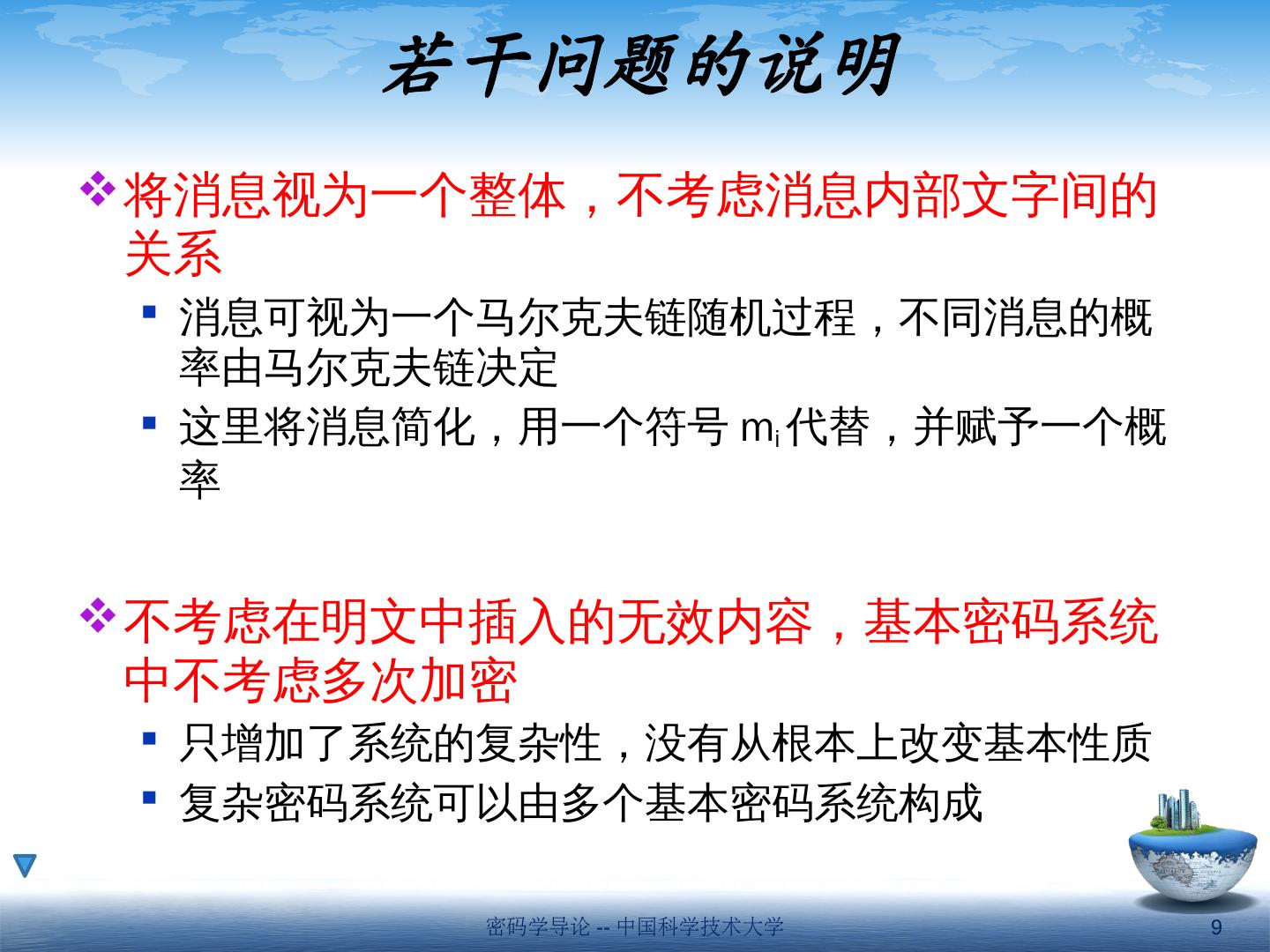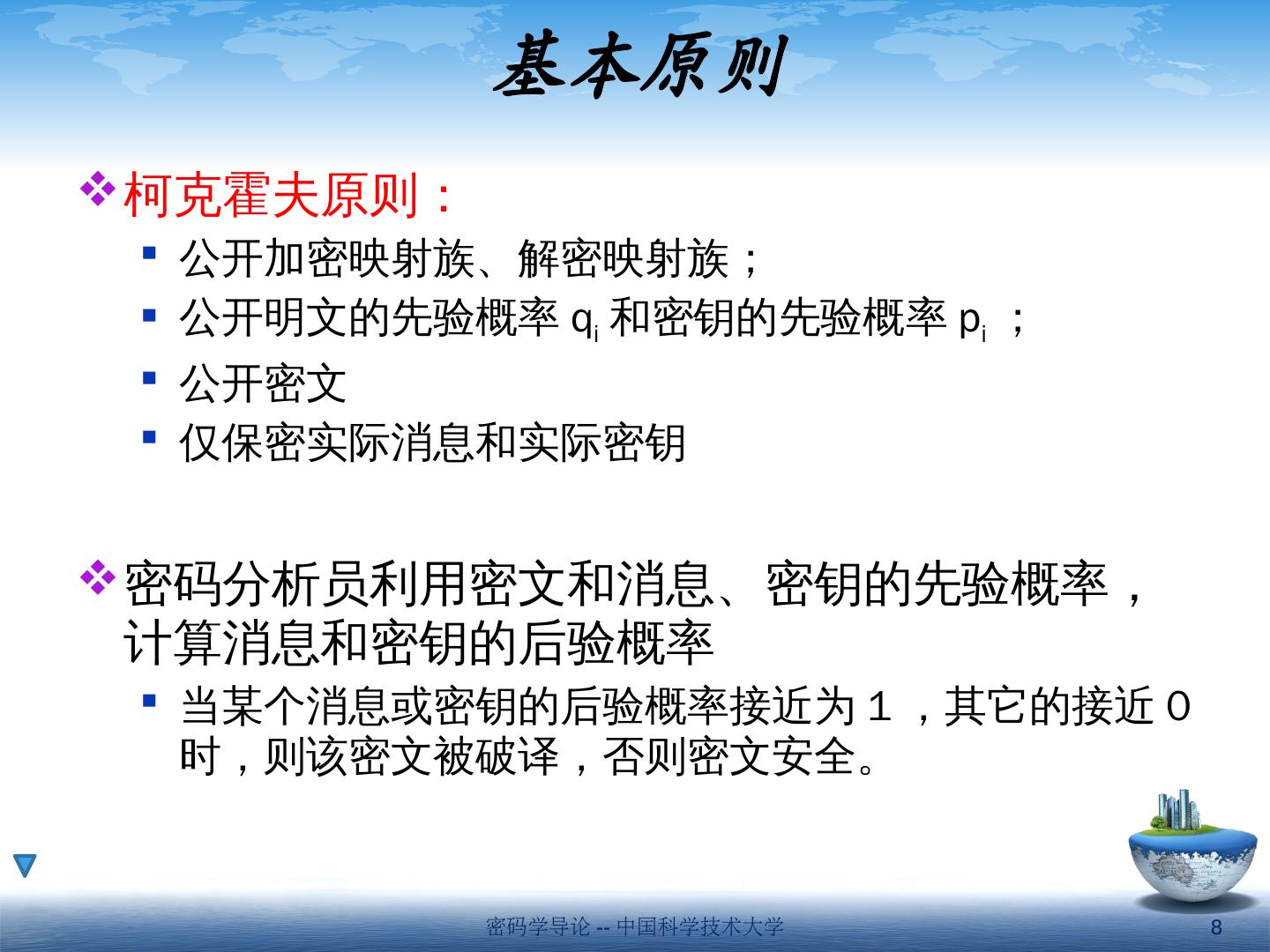 8 .基本原则 柯克霍夫原则: 公开加密映射族、解密映射族; 公开明文的先验概率 q i 和密钥的先验概率 p i ; 公开密文 仅保密实际消息和实际密钥 密码分析员利用密文和消息、密钥的先验概率,计算消息和密钥的后验概率 当某个消息或密钥的后验概率接近为 1 ,其它的接近 0 时,则该密文被破译,否则密文安全。 密码学导论 -- 中国科学技术大学 8