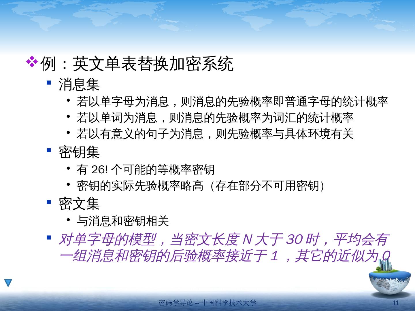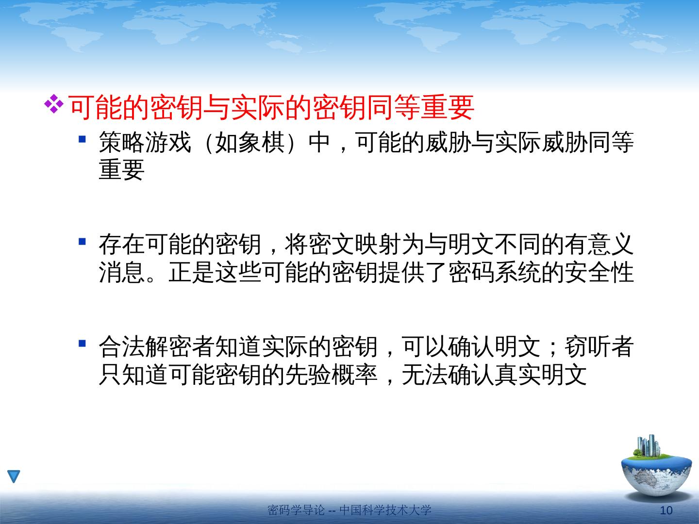 10 .可能的密钥与实际的密钥同等重要 策略 游戏(如象棋)中,可能的威胁与实际威胁同等 重要 存在可能的密钥,将密文映射为与明文不同的有意义消息。正是 这些可能的密钥提供了密码系统的 安全性 合法 解密者知道实际的密钥,可以确认明文;窃听者只知道可能密钥的先验概率,无法确认真实明文 密码学导论 -- 中国科学技术大学 10