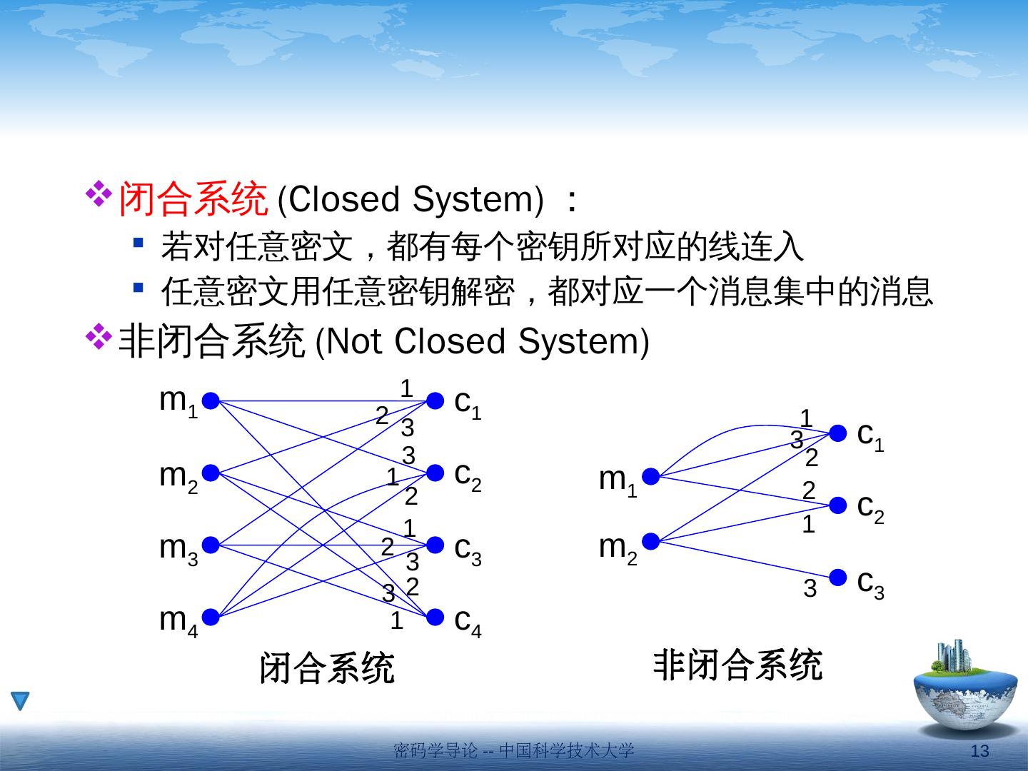 13 .闭合系统 (Closed System) : 若对任意密文,都有每个密钥所对应的线连入 任意密文用任意密钥解密,都对应一个消息集中的消息 非闭合系统 (Not Closed System) c 1 c 2 c 3 m 1 m 2 1 3 2 2 1 3 闭合系统 非闭合系统 m 1 m 2 m 3 m 4 c 1 c 2 c 3 c 4 1 2 3 1 2 3 1 2 3 1 2 3 密码学导论 -- 中国科学技术大学 13