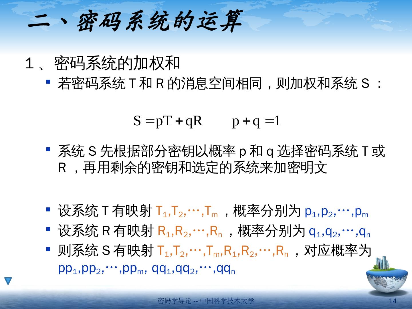 14 .二、密码系统的运算 1 、密码系统的加权和 若密码系统 T 和 R 的消息空间相同,则加权和系统 S : 系统 S 先根据部分密钥以概率 p 和 q 选择密码系统 T 或 R ,再用剩余的密钥和选定的系统来加密明文 设系统 T 有映射 T 1 ,T 2 ,…,T m ,概率分别为 p 1 ,p 2 ,…,p m 设 系统 R 有映射 R 1 ,R 2 ,…, R n , 概率分别为 q 1 ,q 2 ,…, q n 则系统 S 有映射 T 1 ,T 2 ,…,T m ,R 1 ,R 2 ,…, R n ,对应概率为 pp 1 ,pp 2 ,…,pp m , qq 1 ,qq 2 ,…, qq n 密码学导论 -- 中国科学技术大学 14