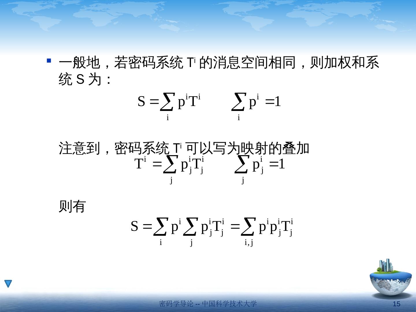 15 .一般地,若密码系统 T i 的消息空间相同,则加权和系统 S 为: 注意到,密码系统 T i 可以写为映射的叠加 则有 密码学导论 -- 中国科学技术大学 15