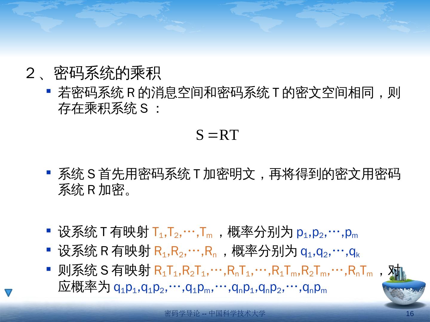 16 .2 、密码系统的乘积 若密码系统 R 的消息空间和密码系统 T 的密文空间相同,则存在乘积系统 S : 系统 S 首先用密码系统 T 加密明文,再将得到的密文用密码系统 R 加密。 设系统 T 有映射 T 1 ,T 2 ,…,T m ,概率分别为 p 1 ,p 2 ,…,p m 设系统 R 有映射 R 1 ,R 2 ,…, R n , 概率分别为 q 1 ,q 2 ,…, q k 则系统 S 有映射 R 1 T 1 ,R 2 T 1 ,…,R n T 1 ,…,R 1 T m ,R 2 T m ,…, R n T m ,对应概率为 q 1 p 1 ,q 1 p 2 ,…,q 1 p m ,…,q n p 1 ,q n p 2 ,…, q n p m 密码学导论 -- 中国科学技术大学 16
