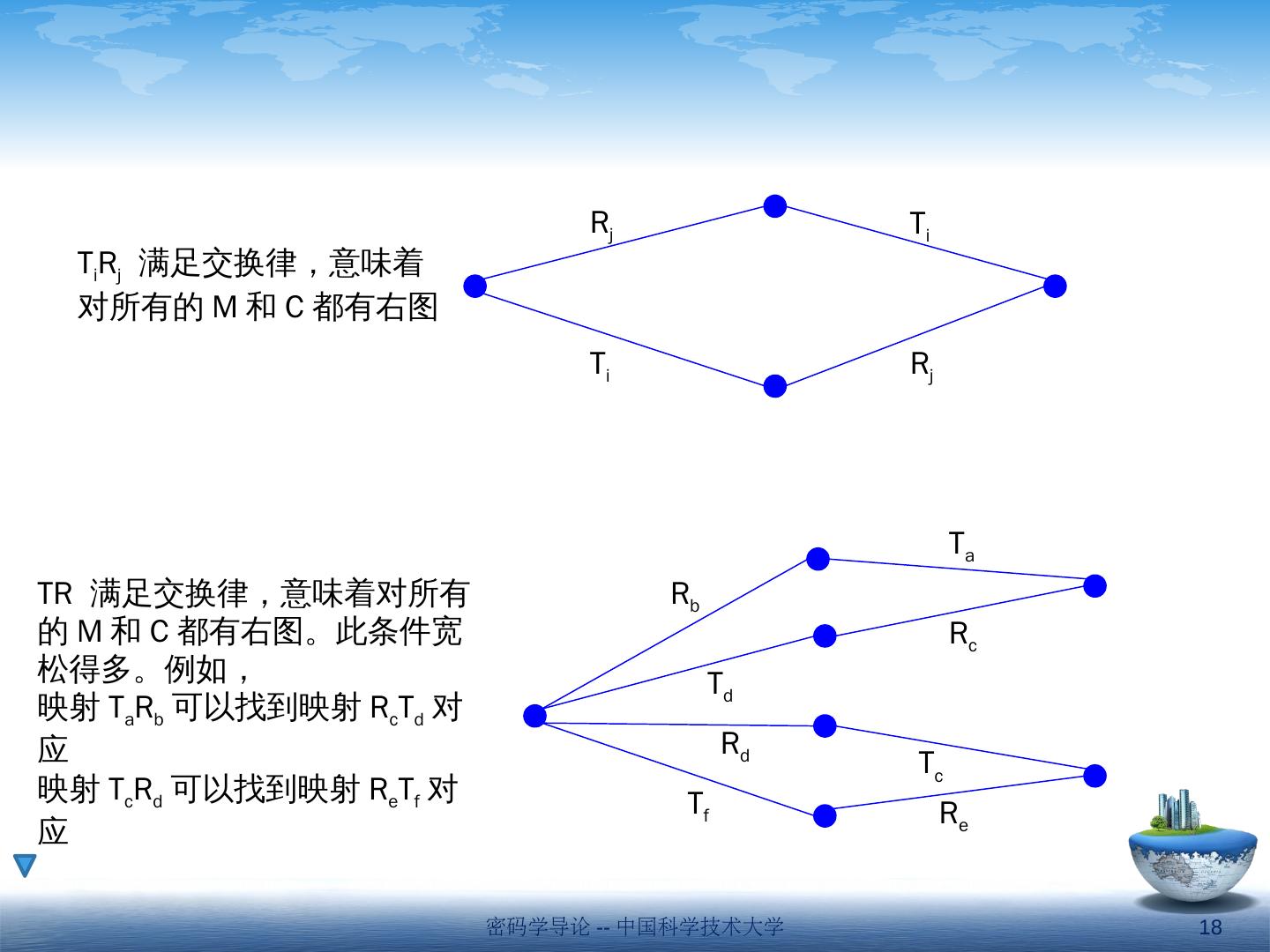 18 .18 密码学导论 -- 中国科学技术大学 T i R j R j T i T i R j 满足交换律,意味着对所有的 M 和 C 都有右图 TR 满足交换律,意味着对所有的 M 和 C 都有右图。此条件宽松得多。例如, 映射 T a R b 可以找到映射 R c T d 对应 映射 T c R d 可以找到映射 R e T f 对应 T a R b R c T d R d T c T f R e