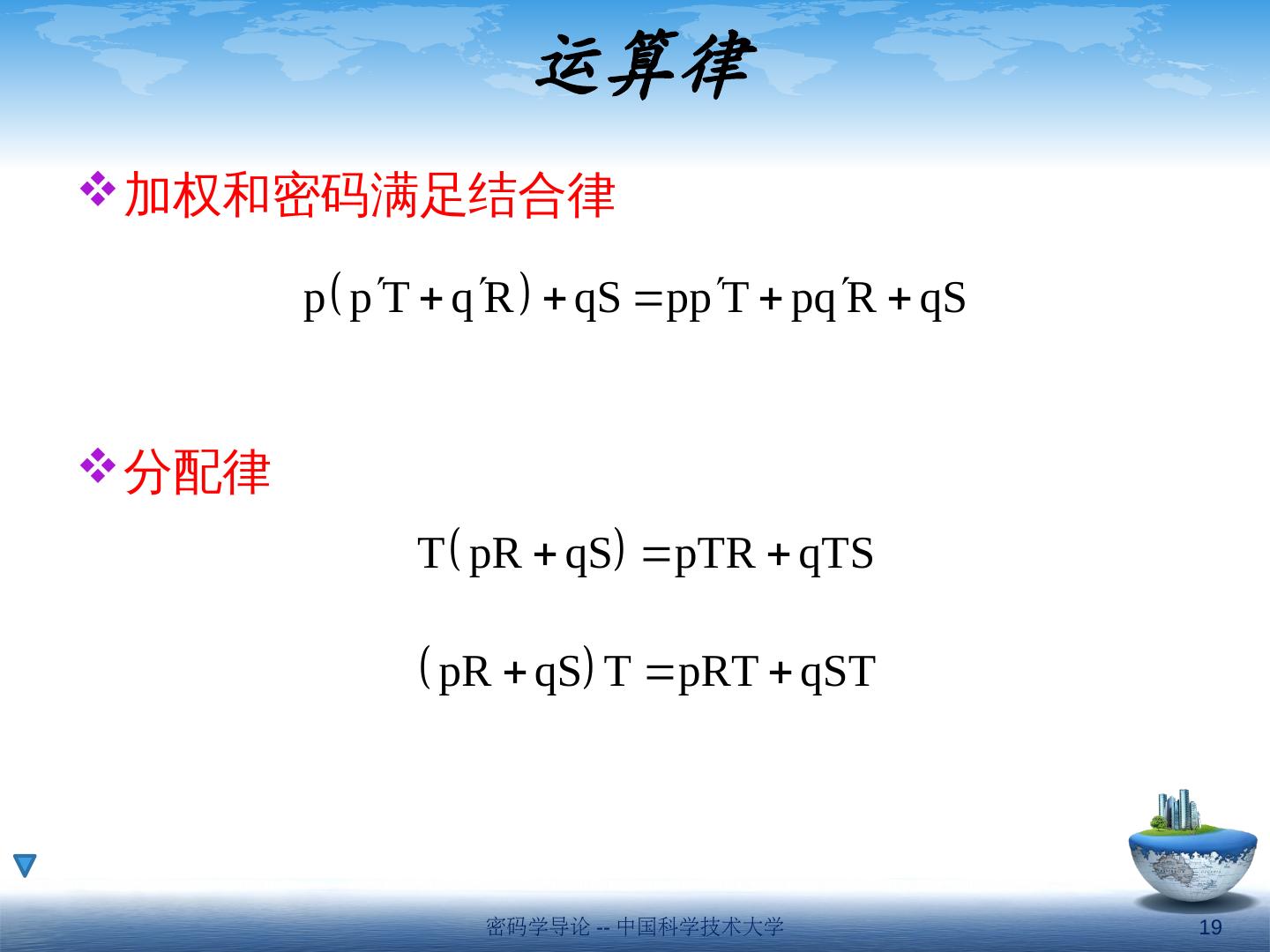 19 .运算律 加权和密码满足结合律 分配律 密码学导论 -- 中国科学技术大学 19
