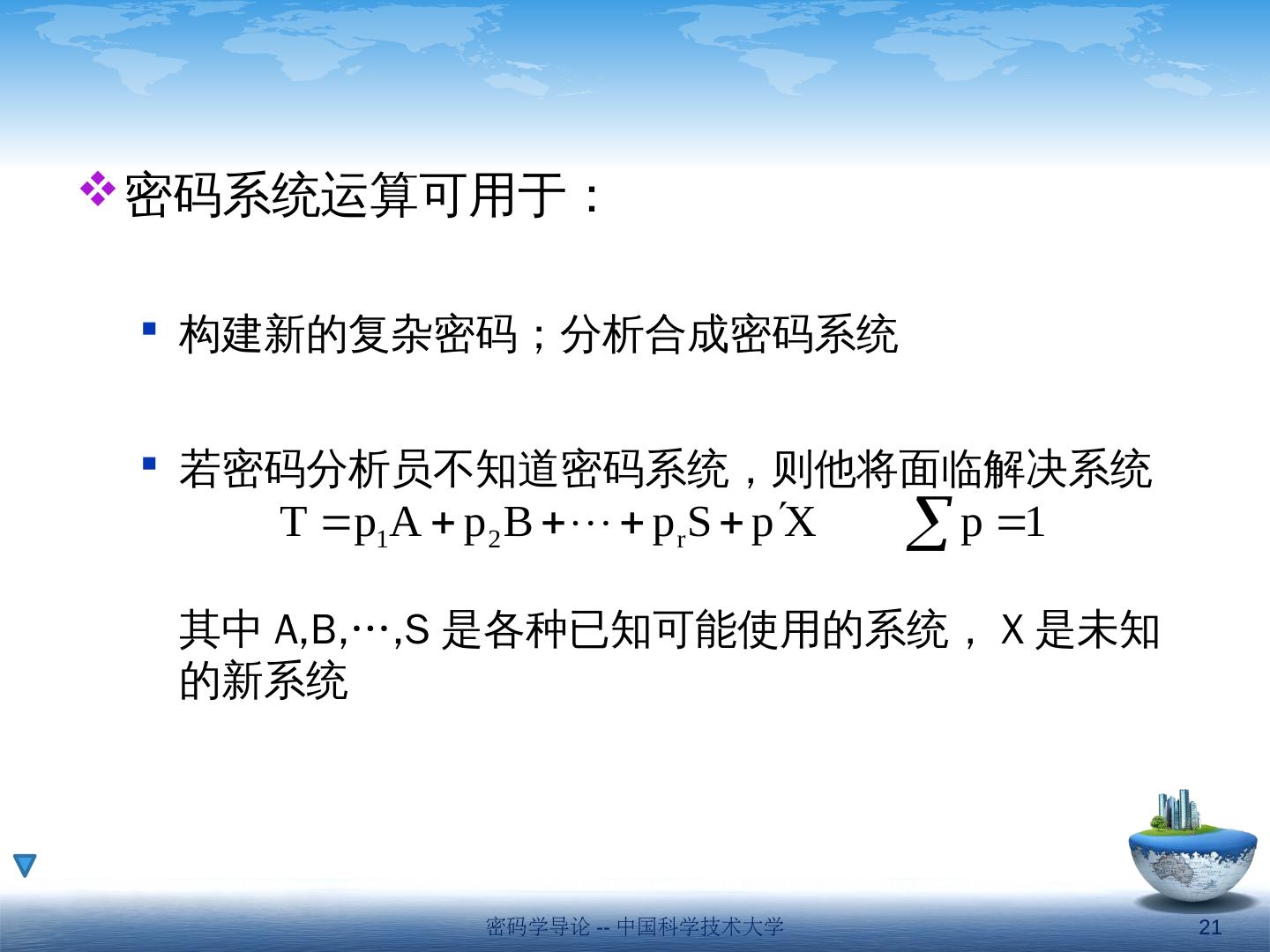 21 .密码系统运算可用于: 构建新的复杂密码;分析合成密码系统 若密码分析员不知道密码系统,则他将面临解决系统 其中 A,B,…,S 是各种已知可能使用的系统, X 是未知的新系统 密码学导论 -- 中国科学技术大学 21