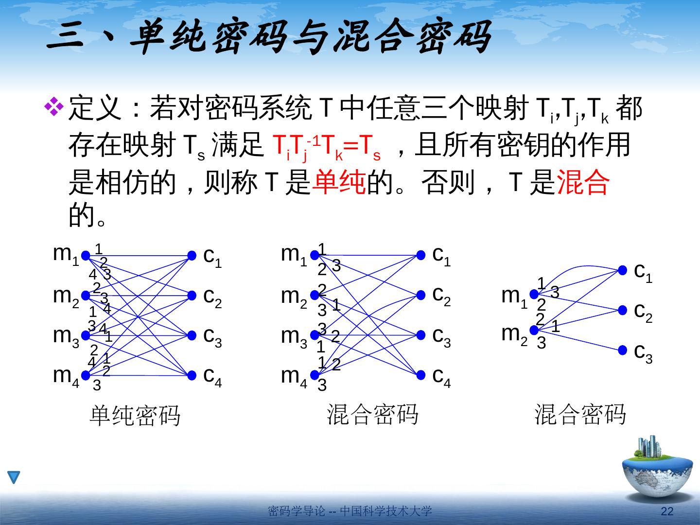 22 .三、单纯密码与混合密码 定义:若对密码系统 T 中任意三个映射 T i ,T j ,T k 都存在映射 T s 满足 T i T j -1 T k =T s ,且所有密钥的作用是相仿 的 ,则称 T 是 单纯 的。否则, T 是 混合 的。 c 1 c 2 c 3 m 1 m 2 1 3 2 2 1 3 m 1 m 2 m 3 m 4 c 1 c 2 c 3 c 4 1 2 3 1 2 3 1 2 3 1 2 3 m 1 m 2 m 3 m 4 c 1 c 2 c 3 c 4 1 2 3 4 1 2 3 4 2 3 4 1 3 4 2 1 单纯密码 混合密码 混合密码 密码学导论 -- 中国科学技术大学 22