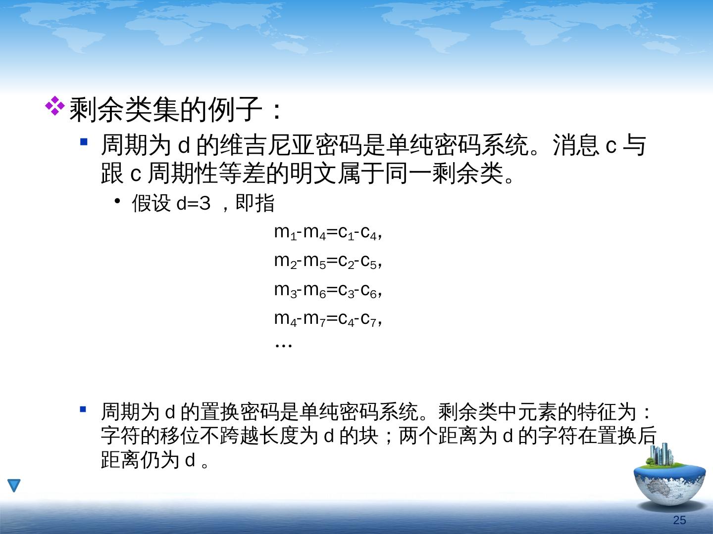 24 .剩余类集的例子: 单表代换是单纯密码系统。密文 c 与 T i T k -1 c 属于同一剩余类。 例如, c=XCPPGCFQ , c 1 =RDHHGDSN , c 2 =ABCCDBEF 等等属于同一剩余类。可以看到,它们有相同的字母重复模式。 凯撒密码中,字母差距恒定的密文属于同一剩余类。 c,c+1,c+2,…,c+25 属于同一剩余类。 破译时,只须列出该剩余类中的其余 25 个消息,挑出有意义的一个。 24