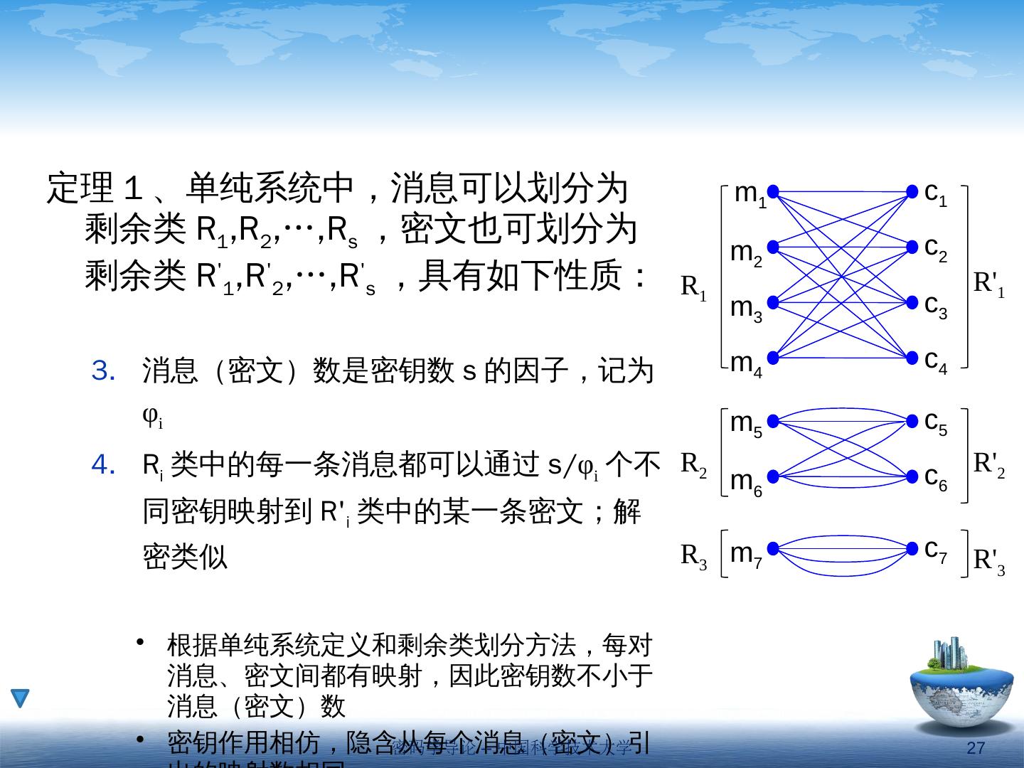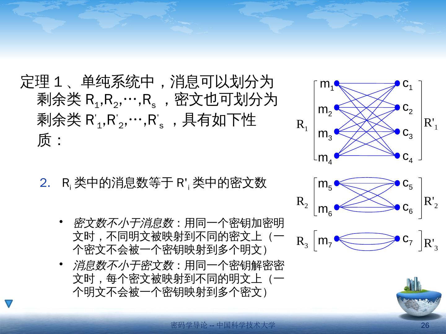 23 .定理 1 、单纯系统中,消息可以划分为剩余类 R 1 ,R 2 ,…,R s ,密文也可划分为剩余类 R 1 ,R 2 ,…,R s ,具有如下性质: 消息剩余类(或密文剩余类)是互斥的, R i 类中任一消息对应的密文必在 R i 类中, R i 类中任一密文对应的消息必在 R i 类 中 剩余类划分的规则 m 1 m 2 m 3 m 4 c 1 c 2 c 3 c 4 m 5 m 6 m 7 c 5 c 6 c 7 R 1 R 2 R 3 R 1 R 2 R 3 密码学导论 -- 中国科学技术大学 23