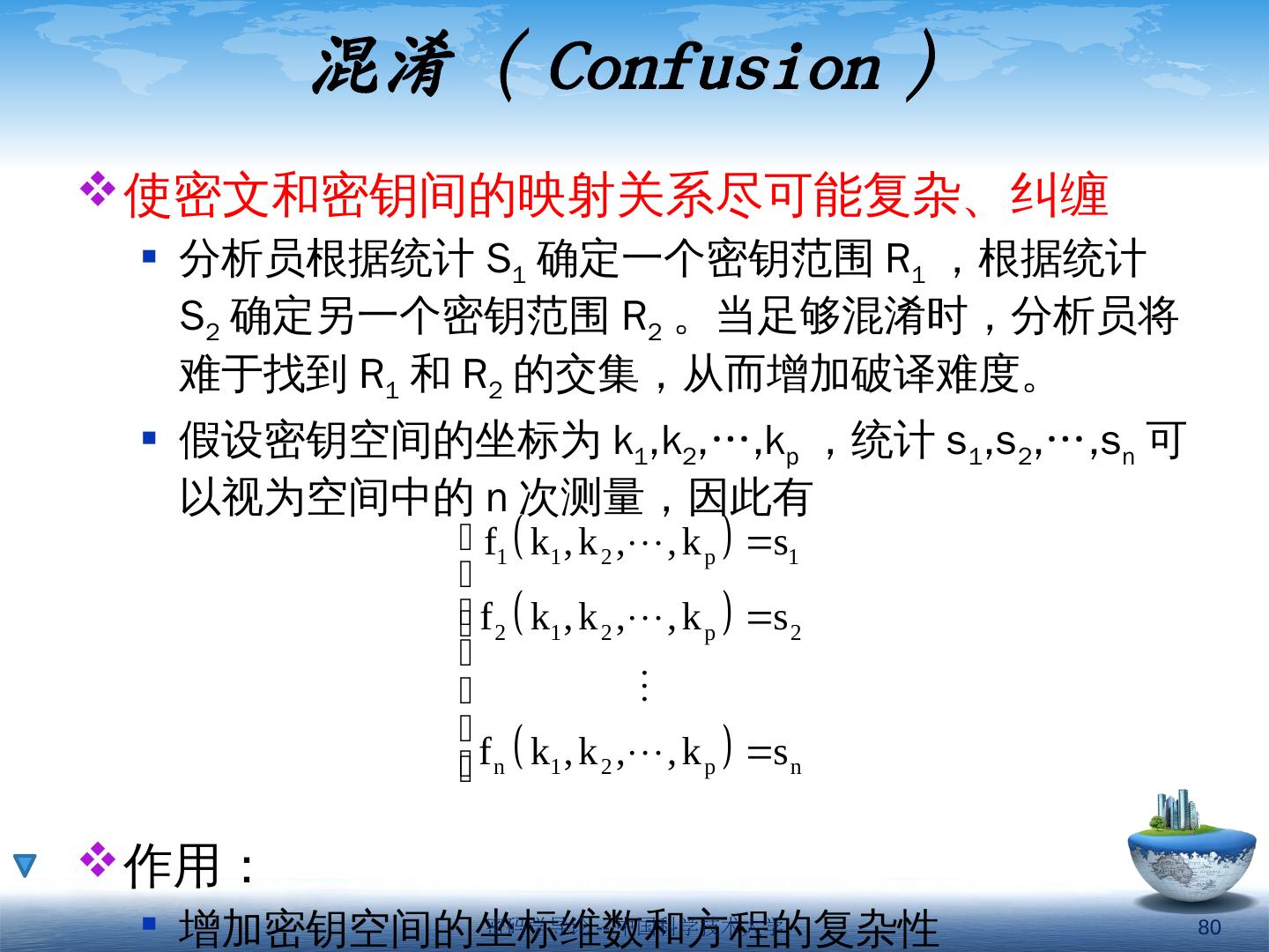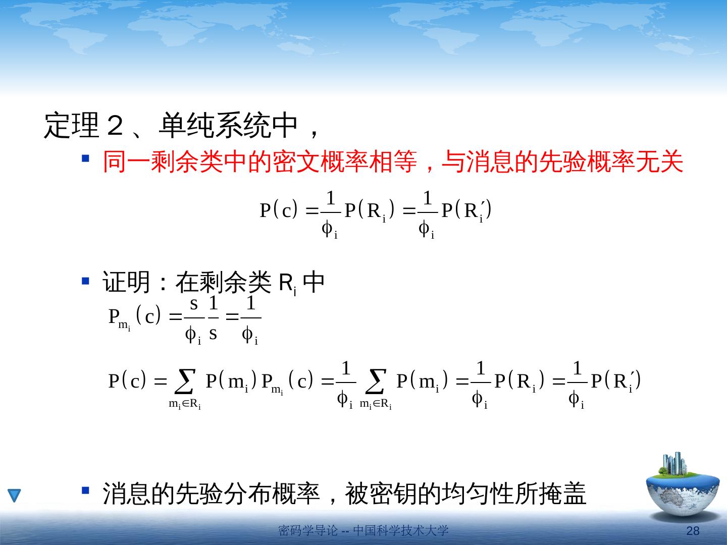 28 .定理 2 、单纯系统中, 同一剩余类中的密文概率相等,与消息的先验概率无关 证明 :在剩余类 R i 中 消息 的先验分布概率,被密钥的均匀性所 掩盖 密码学导论 -- 中国科学技术大学 28