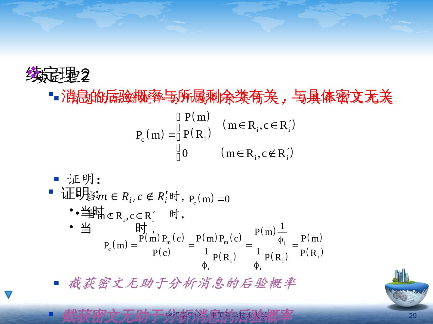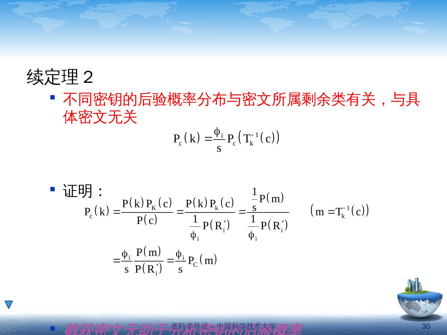 29 .续定理 2 消息的后验概率与所属剩余类有关,与具体密文无关 证明: 当 时, 当 时, 截获密文无助于分析消息的后验概率 密码学导论 -- 中国科学技术大学 29