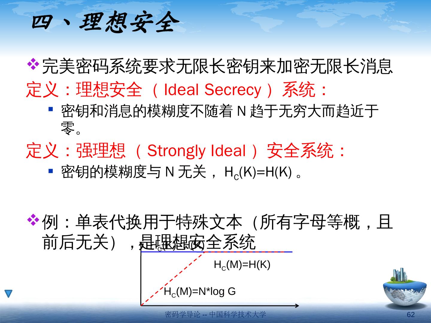 11 .例:英文单表替换加密系统 消息集 若以单字母为消息,则消息的先验概率即普通字母的统计概率 若以单词为消息,则消息的先验概率为词汇的统计概率 若以有意义的句子为消息,则先验概率与具体环境有关 密钥集 有 26! 个可能的等概率密钥 密钥的实际先验概率略高(存在部分不可用密钥) 密文集 与消息和密钥相关 对单字母的模型,当密文长度 N 大于 30 时,平均会有一组消息和密钥的后验概率接近于 1 ,其它的近似为 0 密码学导论 -- 中国科学技术大学 11