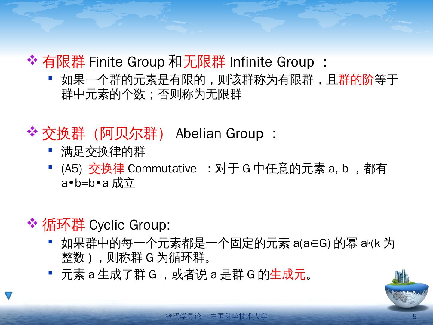 5 .有限群 Finite Group 和 无限群 Infinite Group : 如果一个群的元素是有限的,则该群称为有限群,且 群的阶 等于群中元素的个数;否则称为无限群 交换群(阿贝尔群) Abelian Group : 满足交换律的群 (A5) 交换律 Commutative :对于 G 中任意的元素 a, b ,都有 a•b = b•a 成立 循环群 Cyclic Group: 如果群中的每一个元素都是一个固定的元素 a( a∈G ) 的幂 a k (k 为整数 ) ,则称群 G 为循环群。 元素 a 生成了群 G ,或者说 a 是群 G 的 生成元 。 密码学导论 -- 中国科学技术大学 5