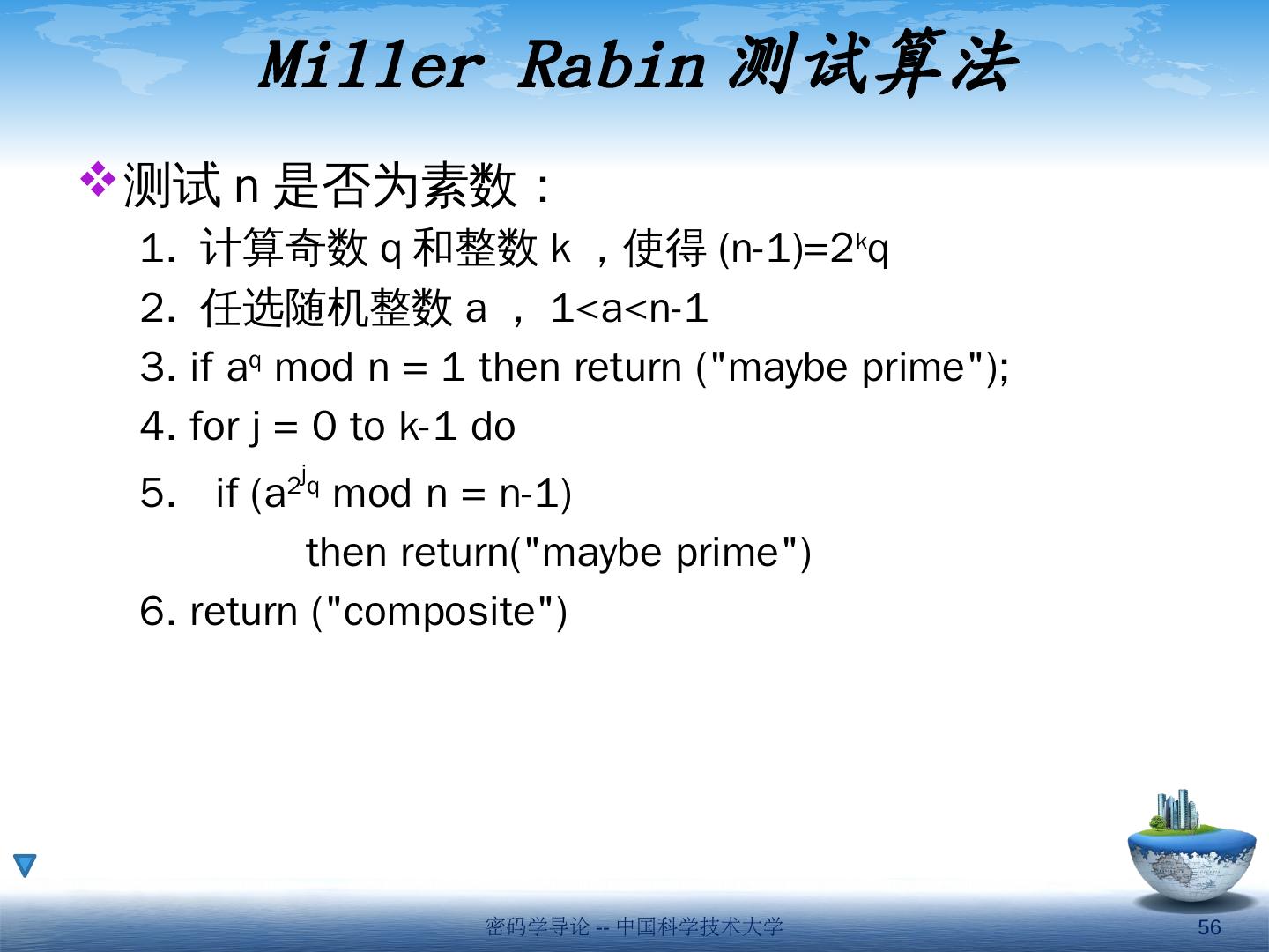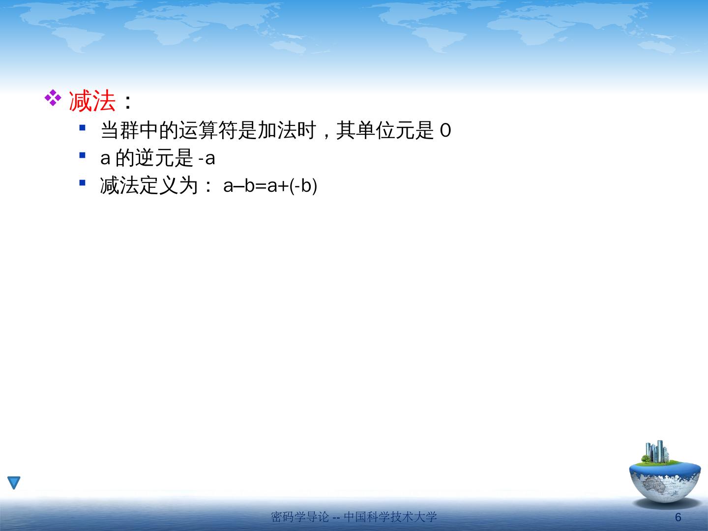 6 .减法 : 当群中的运算符是加法时,其单位元是 0 a 的逆元是 -a 减法定义为: a–b=a+(-b) 密码学导论 -- 中国科学技术大学 6