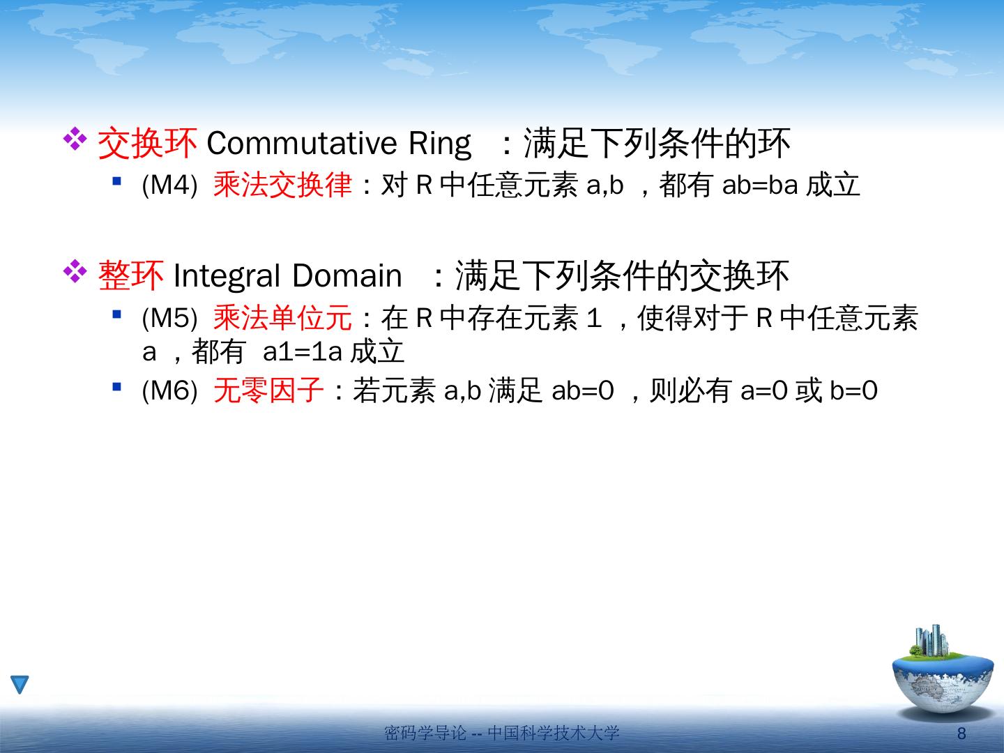 7 .环 Ring : 环 R ,记作 { R,+,x } ,定义二元运算加法“ + ”和乘法“ × ”的集合, R 中任意元素 a,b,c 满足下列公理: (A1-A5), R 关于 加法是交换群 ,单位元是 0 , a 的逆元是 -a (M1) 乘法封闭性 :如果 a 和 b 都属于 R ,则 ab 也属于 R (M2) 乘法结合律 :如果 a,b,c 都属于 R ,则 a( bc )=( ab )c (M3) 分配律 :如果 a,b,c 都属于 R ,则 a( b+c )= ab+ac 或 ( a+b )c = ac+bc 密码学导论 -- 中国科学技术大学 7