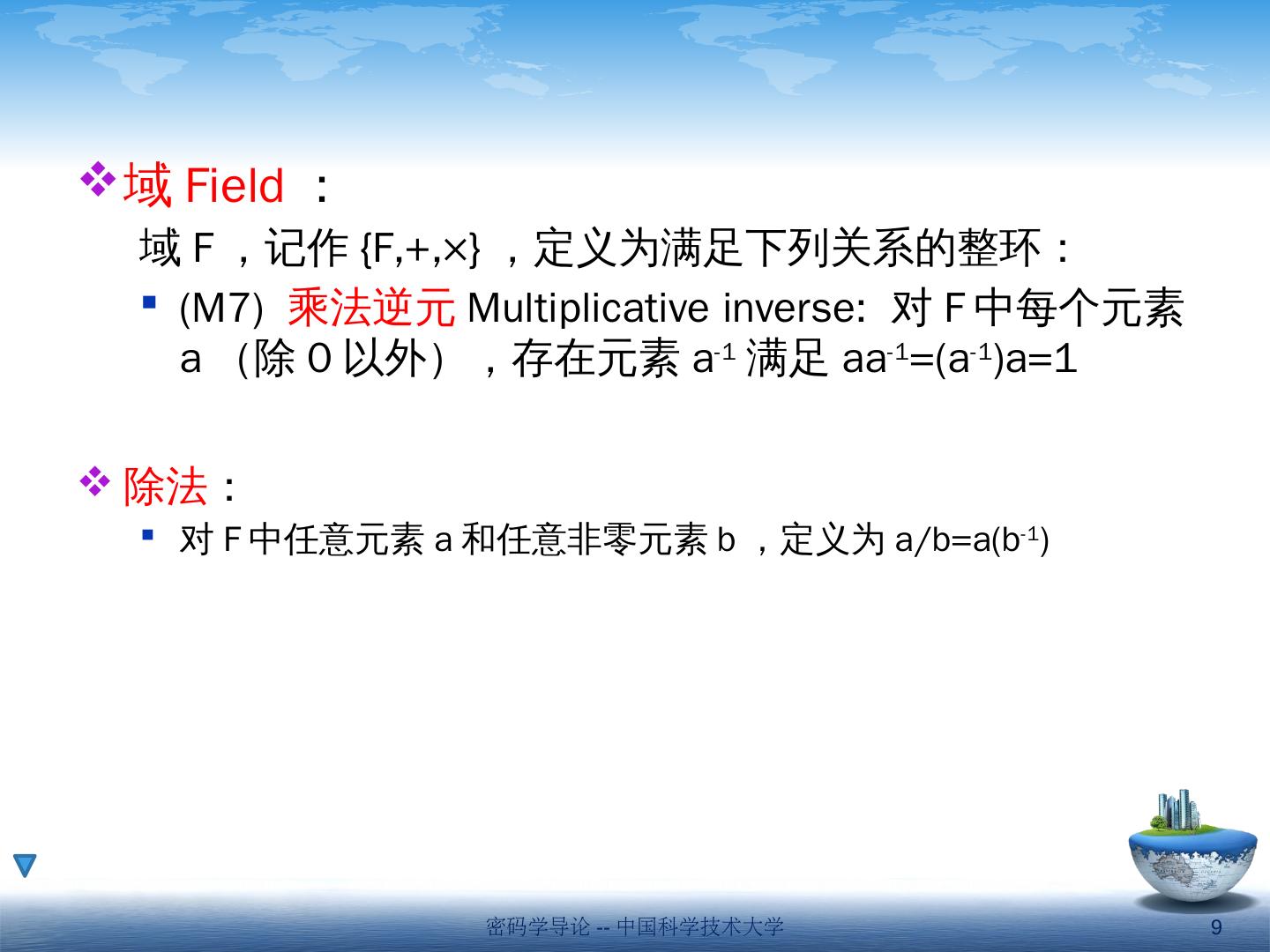9 .域 Field : 域 F ,记作 {F,+,×} ,定义为满足下列关系的整环: (M7) 乘法逆元 Multiplicative inverse: 对 F 中每个元素 a (除 0 以外),存在元素 a -1 满足 aa -1 =(a -1 )a=1 除法 : 对 F 中任意元素 a 和任意非零元素 b ,定义为 a/b=a(b -1 ) 密码学导论 -- 中国科学技术大学 9