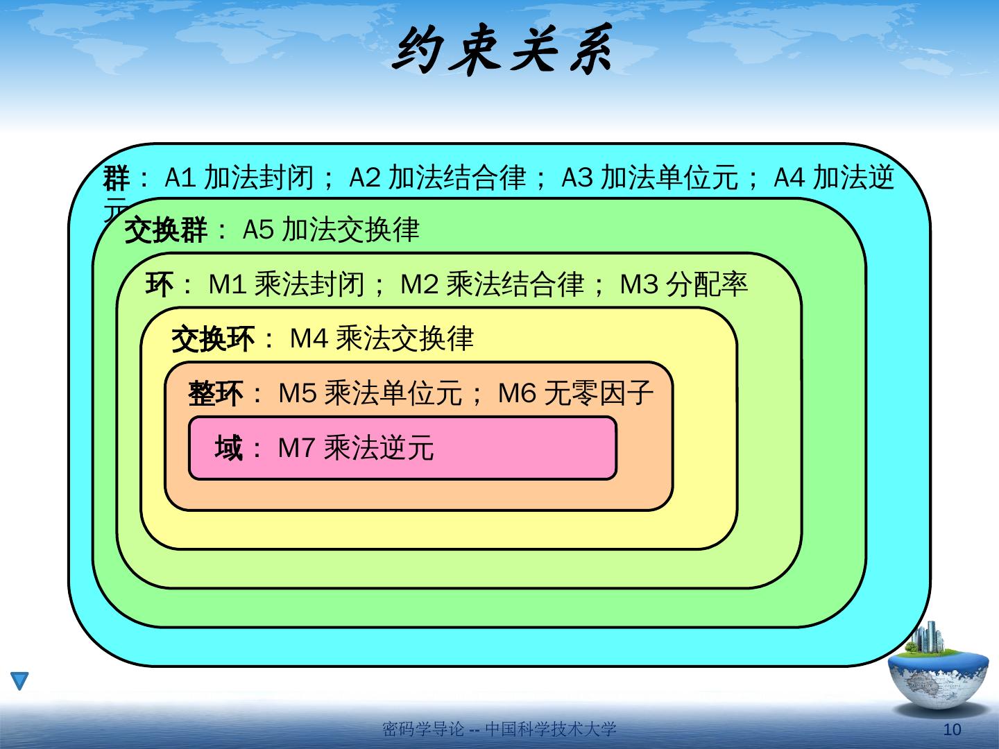 10 .约束关系 群 : A1 加法封闭; A2 加法结合律; A3 加法单位元; A4 加法逆元 交换群 : A5 加法交换律 环 : M1 乘法封闭; M2 乘法结合律; M3 分配率 交换环 : M4 乘法交换律 整环 : M5 乘法单位元; M6 无零因子 域 : M7 乘法逆元 密码学导论 -- 中国科学技术大学 10