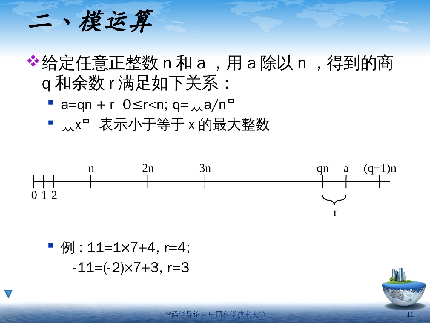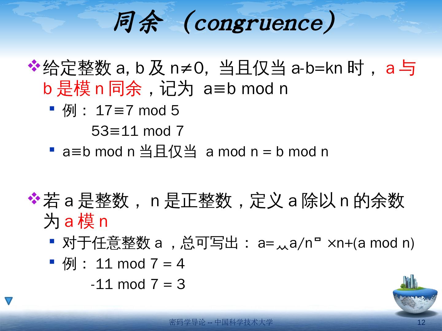 11 .二、模运算 给定任意正整数 n 和 a ,用 a 除以 n ,得到的商 q 和余数 r 满足如下关系: a= qn + r 0≤r<n; q= a/n x 表示小于等于 x 的最大整数 例 : 11=1×7+4, r=4; -11=(-2)×7+3, r=3 n 2n 3n qn (q+1)n 0 1 2 a r 密码学导论 -- 中国科学技术大学 11
