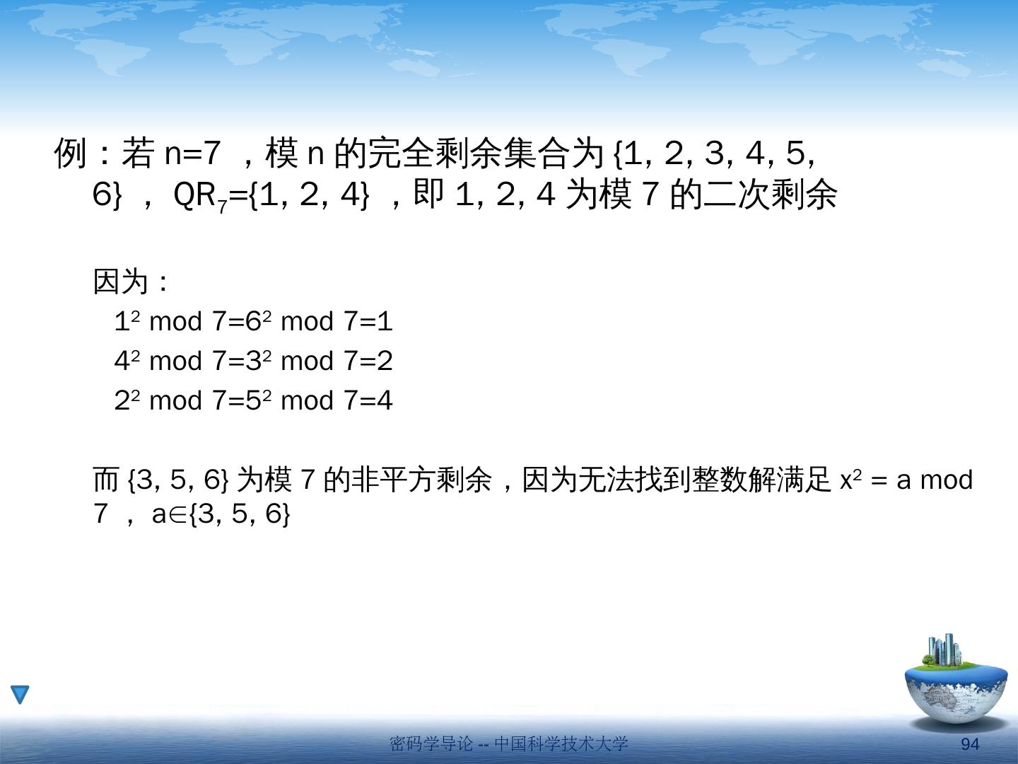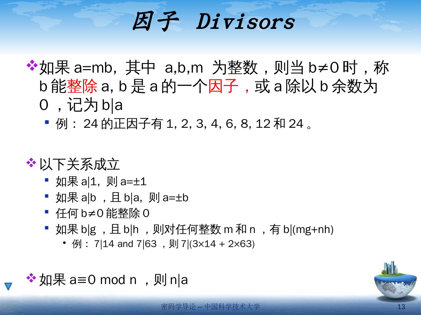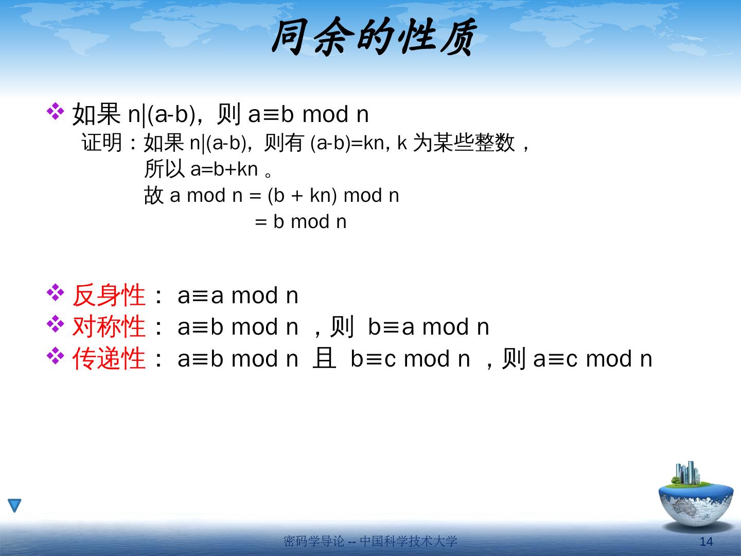 12 .同余 ( congruence) 给定整数 a, b 及 n≠0, 当且仅当 a-b= kn 时, a 与 b 是模 n 同余 ,记为 a≡b mod n 例: 17≡7 mod 5 53≡11 mod 7 a≡b mod n 当且仅当 a mod n = b mod n 若 a 是整数, n 是正整数,定义 a 除以 n 的 余数为 a 模 n 对于任意整数 a ,总可写出: a= a/n ×n+(a mod n) 例: 11 mod 7 = 4 -11 mod 7 = 3 密码学导论 -- 中国科学技术大学 12