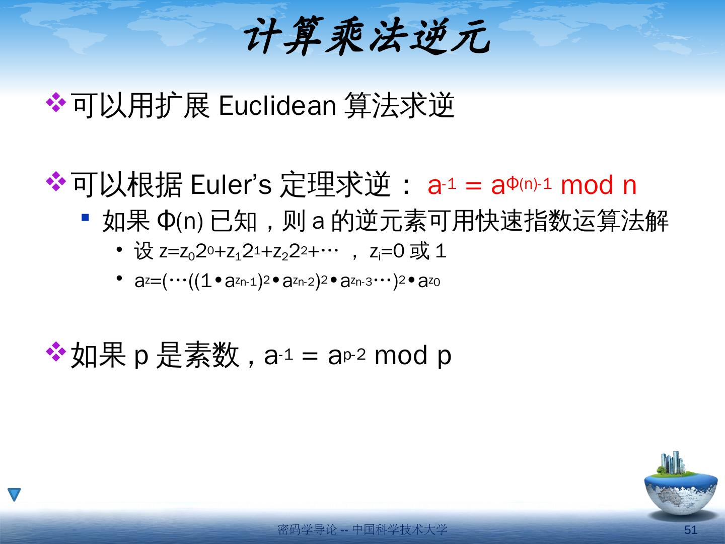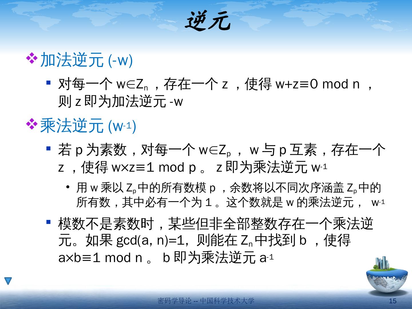 15 .逆元 加法逆元 (-w) 对每一个 w∈Z n ,存在一个 z ,使得 w+z≡0 mod n ,则 z 即为加法逆元 -w 乘法逆元 (w -1 ) 若 p 为素数,对每一个 w∈Z p , w 与 p 互素,存在一个 z ,使得 w × z≡1 mod p 。 z 即为乘法逆元 w -1 用 w 乘以 Z p 中的所有数模 p ,余数将以不同次序涵盖 Z p 中的所有数,其中必有一个为 1 。这个数就是 w 的乘法逆元, w -1 模数不是素数时,某些但非全部整数存在一个乘法逆元。如果 gcd (a, n)=1, 则能在 Z n 中找到 b ,使得 a × b≡1 mod n 。 b 即为乘法逆元 a -1 密码学导论 -- 中国科学技术大学 15