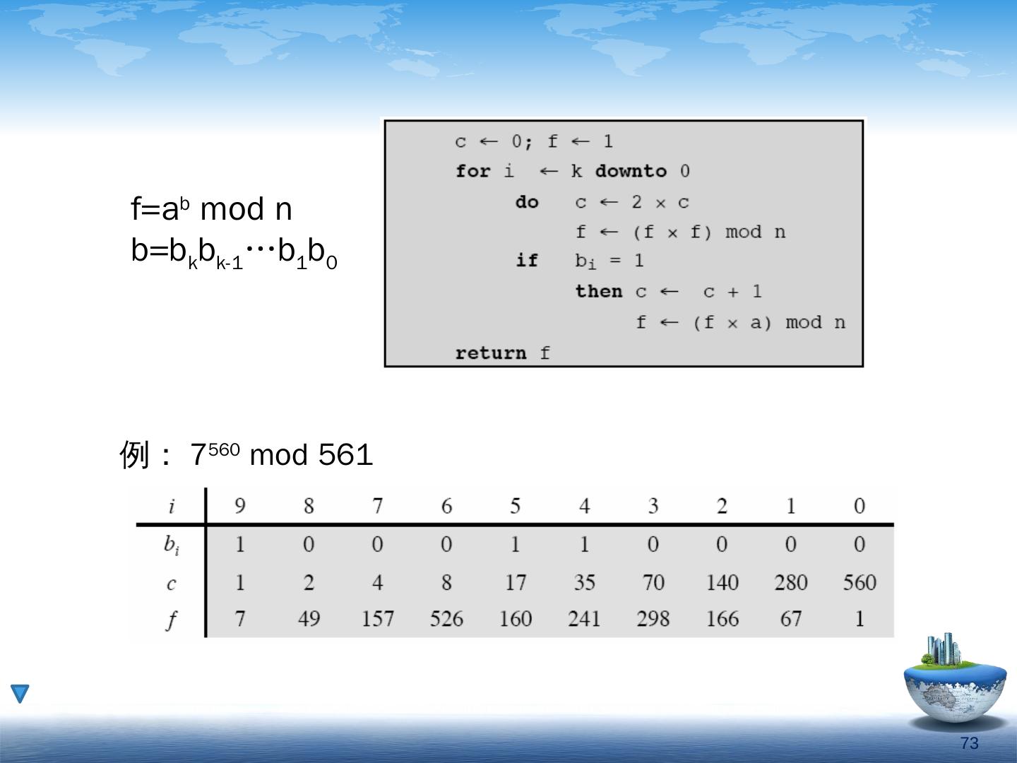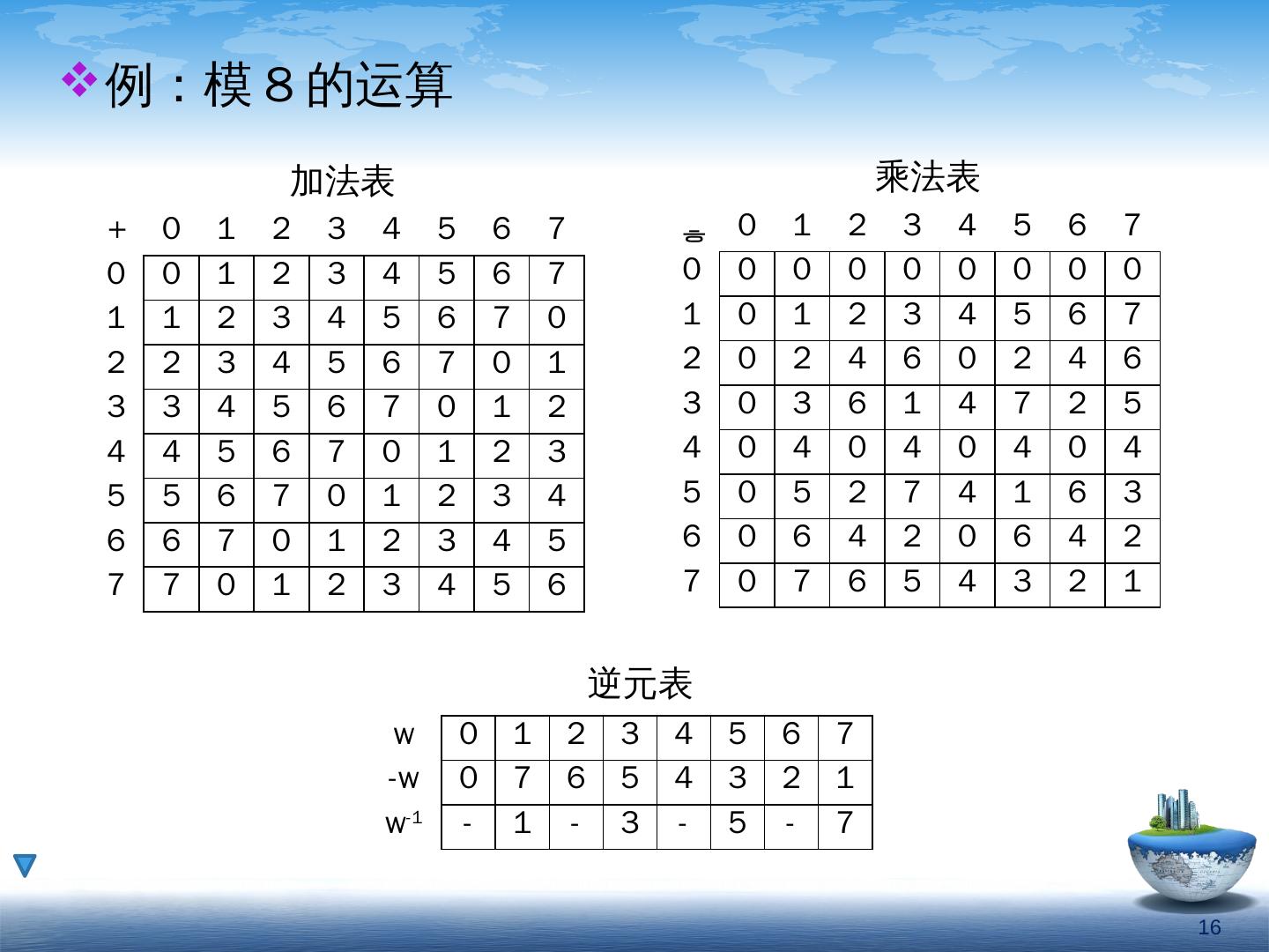 16 .16 例:模 8 的运算 加法表 乘法表 逆元表 + 0 1 2 3 4 5 6 7 0 0 1 2 3 4 5 6 7 1 1 2 3 4 5 6 7 0 2 2 3 4 5 6 7 0 1 3 3 4 5 6 7 0 1 2 4 4 5 6 7 0 1 2 3 5 5 6 7 0 1 2 3 4 6 6 7 0 1 2 3 4 5 7 7 0 1 2 3 4 5 6 0 1 2 3 4 5 6 7 0 0 0 0 0 0 0 0 0 1 0 1 2 3 4 5 6 7 2 0 2 4 6 0 2 4 6 3 0 3 6 1 4 7 2 5 4 0 4 0 4 0 4 0 4 5 0 5 2 7 4 1 6 3 6 0 6 4 2 0 6 4 2 7 0 7 6 5 4 3 2 1 w 0 1 2 3 4 5 6 7 -w 0 7 6 5 4 3 2 1 w -1 - 1 - 3 - 5 - 7