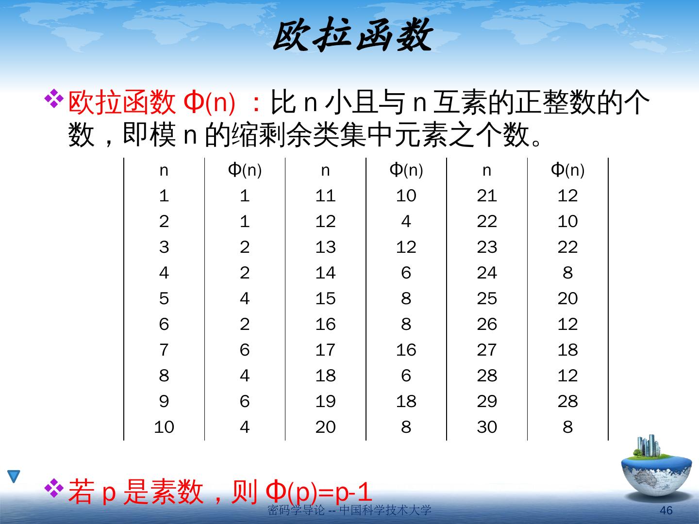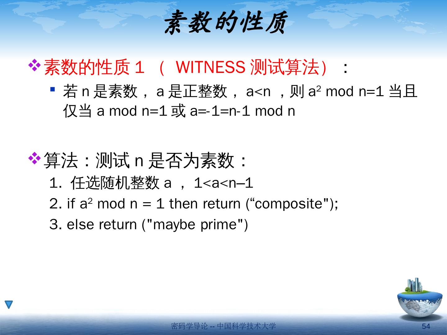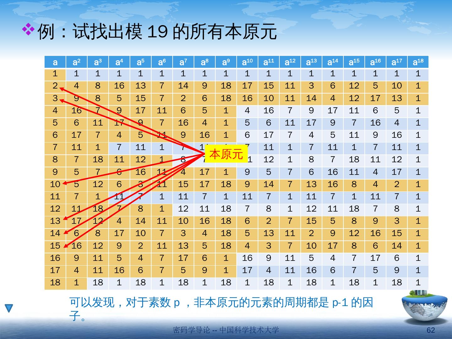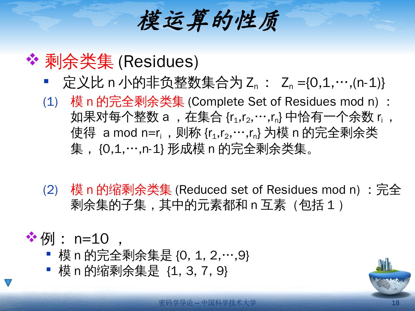 18 .模运算的性质 剩余类集 (Residues) 定义比 n 小的非负整数集合为 Z n : Z n ={0,1,…,(n-1)} 模 n 的完全剩余类集 (Complete Set of Residues mod n) :如果对每个整数 a ,在集合 {r 1 ,r 2 ,…, r n } 中恰有一个余数 r i ,使得 a mod n= r i ,则称 {r 1 ,r 2 ,…, r n } 为模 n 的完全剩余类集, {0,1,…,n-1} 形成模 n 的完全剩余类集。 模 n 的缩剩余类集 (Reduced set of Residues mod n) :完全剩余集的子集,其中的元素都和 n 互素(包括 1 ) 例: n=10 , 模 n 的完全剩余集是 {0, 1, 2,…,9} 模 n 的缩剩余集是 {1, 3, 7, 9} 密码学导论 -- 中国科学技术大学 18