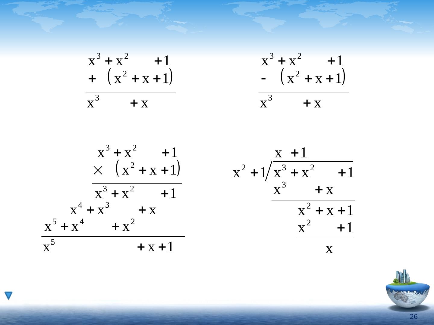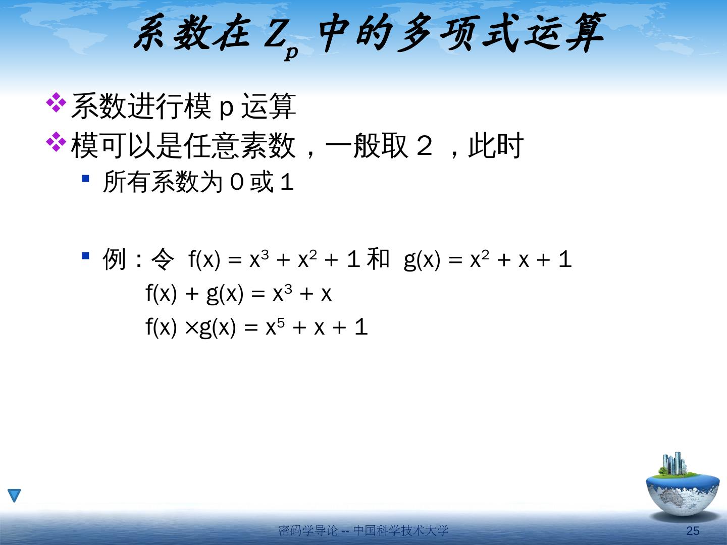 25 .系数在 Z p 中的多项式运算 系数进行模 p 运算 模可以是任意素数,一般取 2 ,此时 所有系数为 0 或 1 例:令 f(x) = x 3 + x 2 + 1 和 g(x) = x 2 + x + 1 f(x) + g(x) = x 3 + x f(x) × g(x) = x 5 + x + 1 密码学导论 -- 中国科学技术大学 25