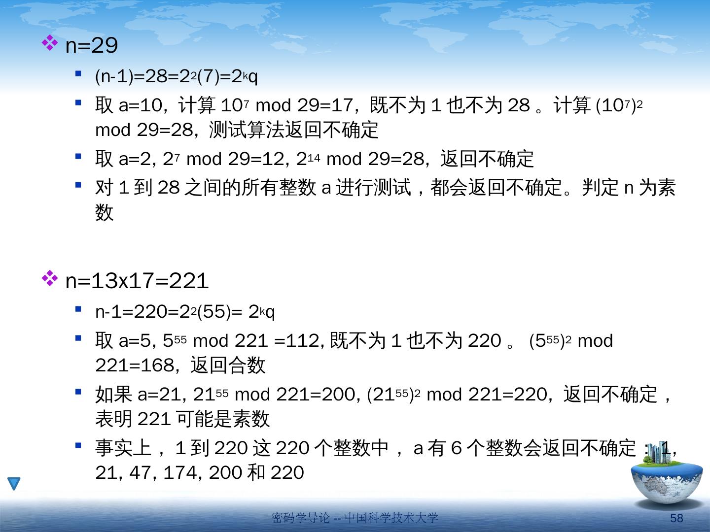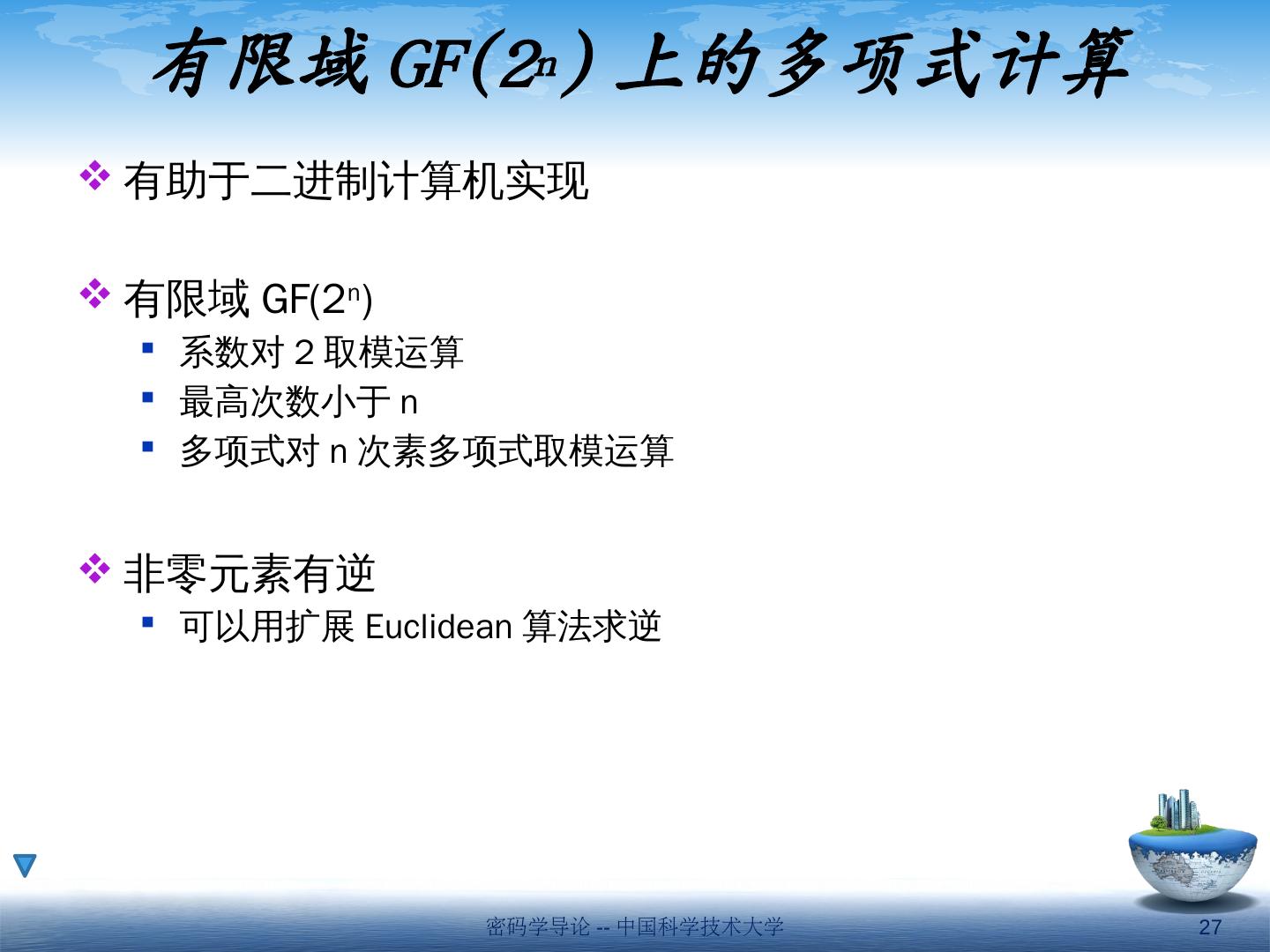 27 .有限域 GF(2 n ) 上的多项式计算 有助于二进制计算机实现 有限域 GF(2 n ) 系数对 2 取模运算 最高次数小于 n 多项式对 n 次素多项式取模运算 非零元素有逆 可以用扩展 Euclidean 算法求逆 密码学导论 -- 中国科学技术大学 27